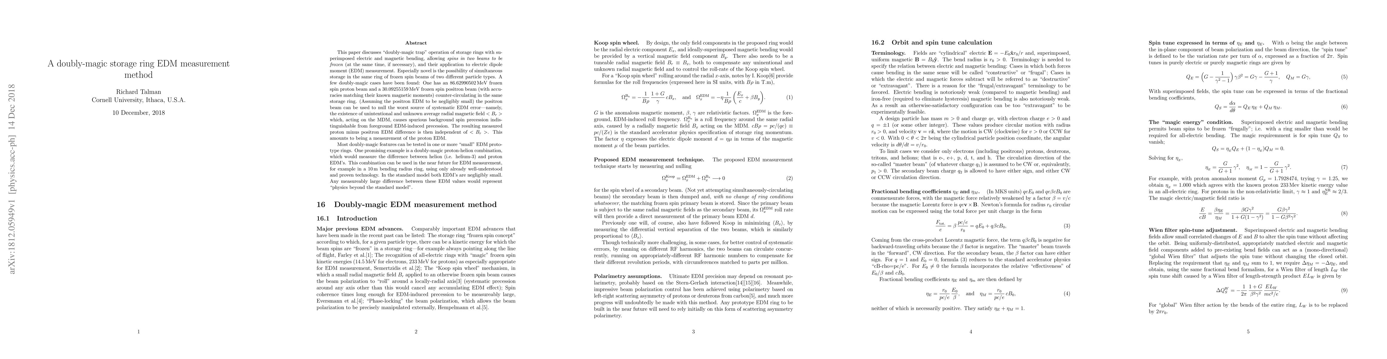 This paper discusses "doubly-magic trap" operation of storage rings with superimposed electric and magnetic bending, to allow the spins of beams of different particle type to be frozen (i.e. both magic) simultaneously. A few doubly-magic cases have been found; one has 86.62990502 MeV frozen spin protons and 30.09255159 MeV frozen spin positrons (with accuracies matching their known magnetic moments) counter-circulating in the same storage ring. (Assuming zero positron EDM value) the positron beam can be used to null the radial magnetic field, enabling the proton EDM to be measured free of the dominant systematic error. The same trick, using 38.6 MeV protons and 39.2 MeV helions (He3) yields the difference of proton and helion EDMs---any measureably large difference would represent physics beyond the standard model---using an inexpensive 10 m bending radius storage ring, and already-proven operational spin control technology.