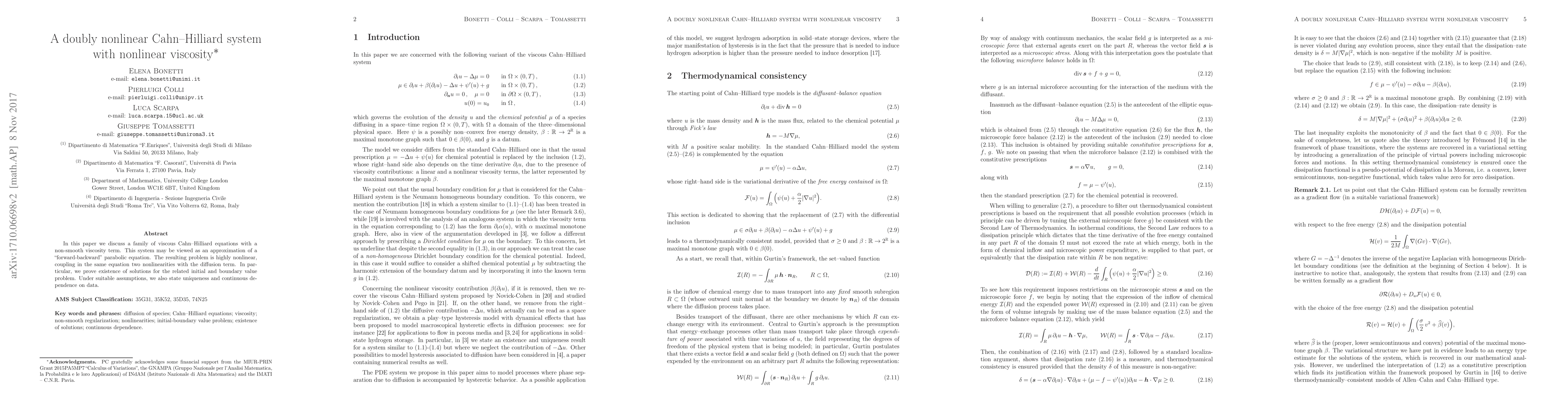 In this paper we discuss a family of viscous Cahn-Hilliard equations with a non-smooth viscosity term. This system may be viewed as an approximation of a "forward-backward" parabolic equation. The resulting problem is highly nonlinear, coupling in the same equation two nonlinearities with the diffusion term. In particular, we prove existence of solutions for the related initial and boundary value problem. Under suitable assumptions, we also state uniqueness and continuous dependence on data.