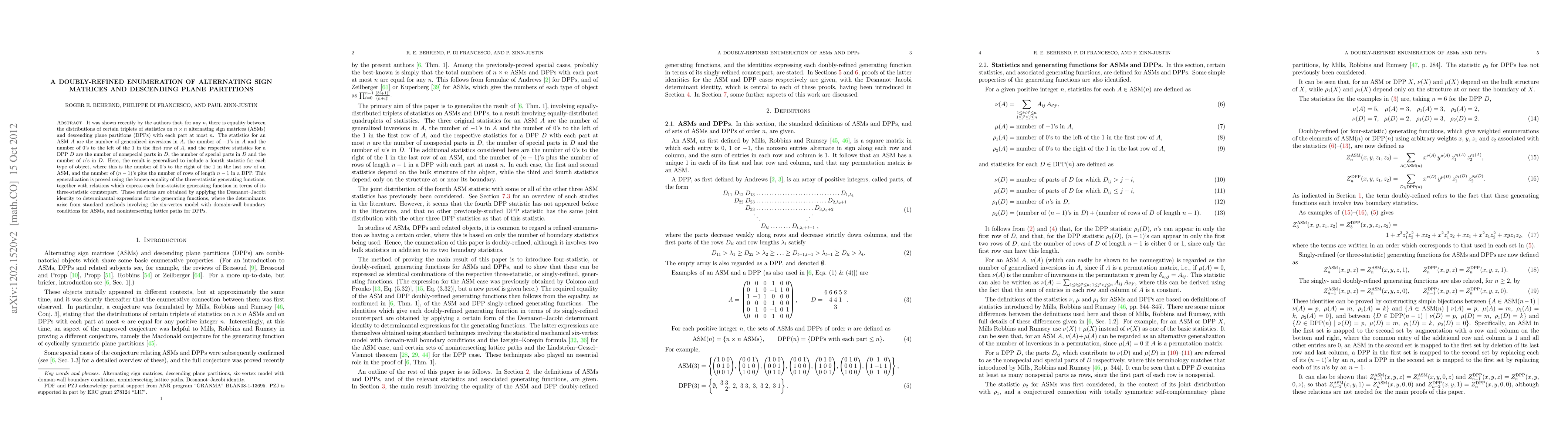 This paper extends the enumeration equality between alternating sign matrices (ASMs) and descending plane partitions (DPPs) by including a fourth statistic for each object. The authors prove this generalization using the known three-statistic generating functions and determinantal expressions derived from the six-vertex model and nonintersecting lattice paths.