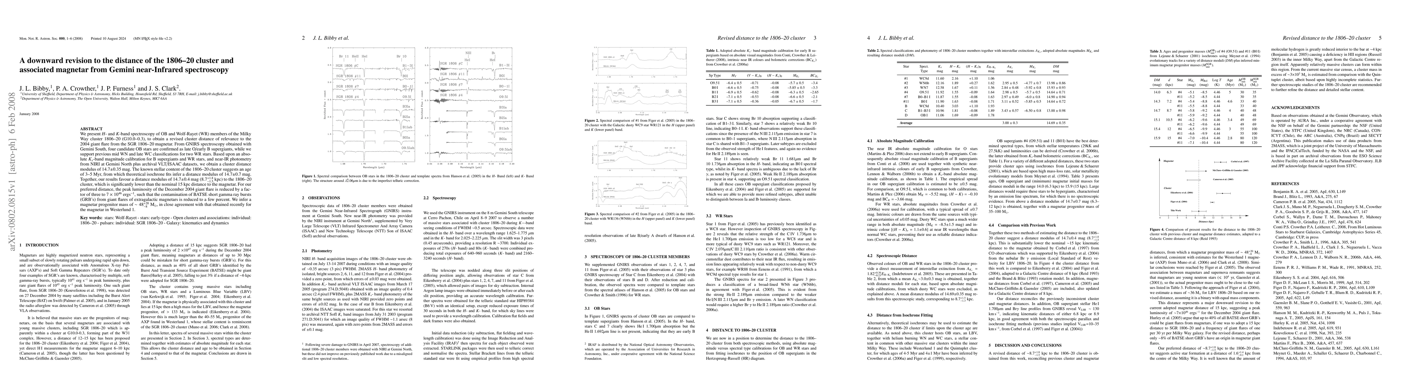 We present H- and K-band spectroscopy of OB and Wolf-Rayet (WR) members of the Milky Way cluster 1806-20 (G10.0-0.3), to obtain a revised cluster distance of relevance to the 2004 giant flare from the SGR 1806-20 magnetar. From GNIRS spectroscopy obtained with Gemini South, four candidate OB stars are confirmed as late O/early B supergiants, while we support previous mid WN and late WC classifications for two WR stars. Based upon an absolute Ks-band magnitude calibration for B supergiants and WR stars, and near-IR photometry from NIRI at Gemini North plus archival VLT/ISAAC datasets, we obtain a cluster distance modulus of 14.7+/-0.35 mag. The known stellar content of the 1806-20 cluster suggests an age of 3-5 Myr, from which theoretical isochrone fits infer a distance modulus of 14.7+/-0.7 mag. Together, our results favour a distance modulus of 14.7+/-0.4 mag (8.7^+1.8_-1.5 kpc) to the 1806-20 cluster, which is significantly lower than the nominal 15 kpc distance to the magnetar. For our preferred distance, the peak luminosity of the December 2004 giant flare is reduced by a factor of three to 7 X 10^46 erg/s, such that the contamination of BATSE short gamma ray bursts (GRB's) from giant flares of extragalactic magnetars is reduced to a few percent. We infer a magnetar progenitor mass of ~48^+20_-8 Msun, in close agreement with that obtained recently for the magnetar in Westerlund 1.