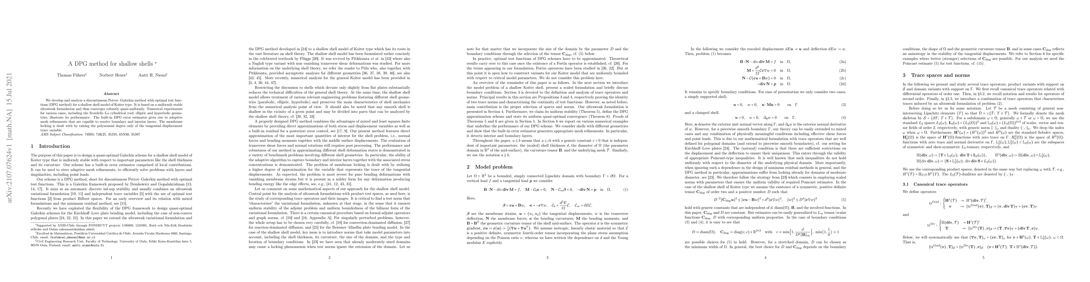 The paper presents a robust discontinuous Petrov-Galerkin (DPG) method for shallow shell models, demonstrating its convergence and performance through numerical experiments on various geometries. The method includes an adaptive mesh refinement strategy and addresses membrane locking by selectively increasing the polynomial degree of the tangential displacement.