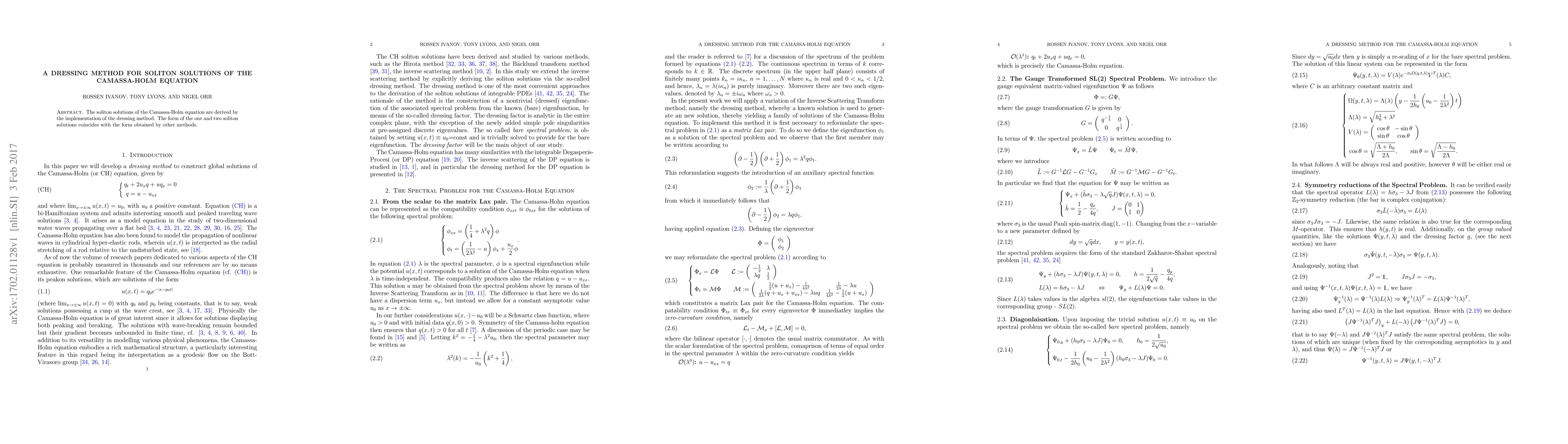This paper derives soliton solutions of the Camassa-Holm equation using the dressing method, confirming that the obtained one and two soliton solutions match those found by alternative approaches.