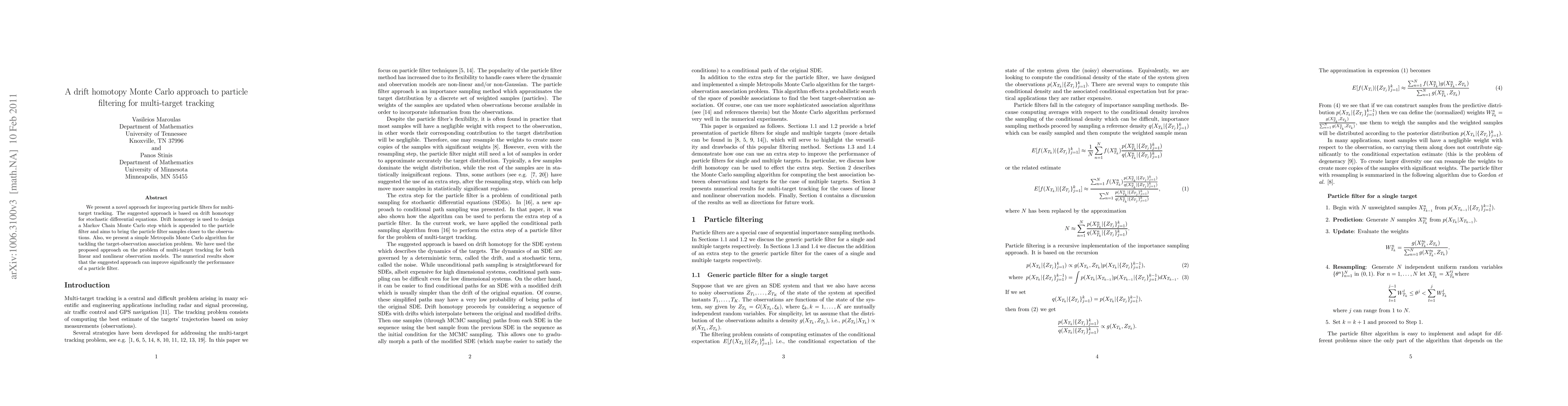 This paper introduces a novel drift homotopy Monte Carlo method to enhance particle filters for multi-target tracking, incorporating a Markov Chain Monte Carlo step to align particle samples with observations. It also employs a simple Metropolis Monte Carlo algorithm for the target-observation association problem, demonstrating improved performance in both linear and nonlinear observation models.