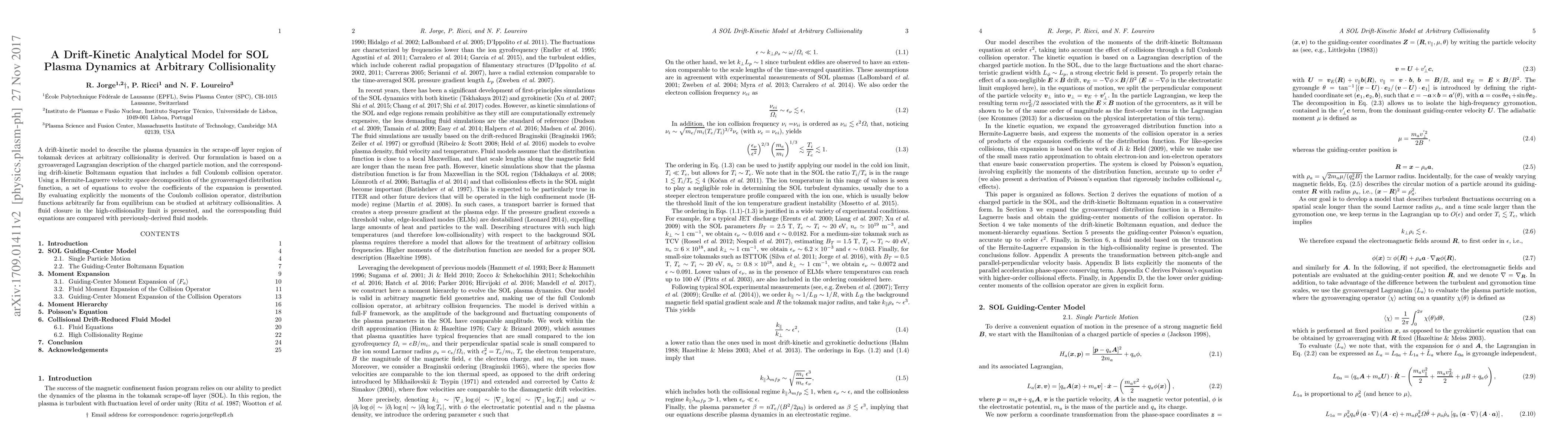 This paper develops a drift-kinetic analytical model for plasma dynamics in the scrape-off layer of tokamak devices, applicable at any collisionality. The model uses a gyroaveraged Lagrangian approach and a drift-kinetic Boltzmann equation with a full Coulomb collision operator, enabling the study of non-equilibrium distribution functions.