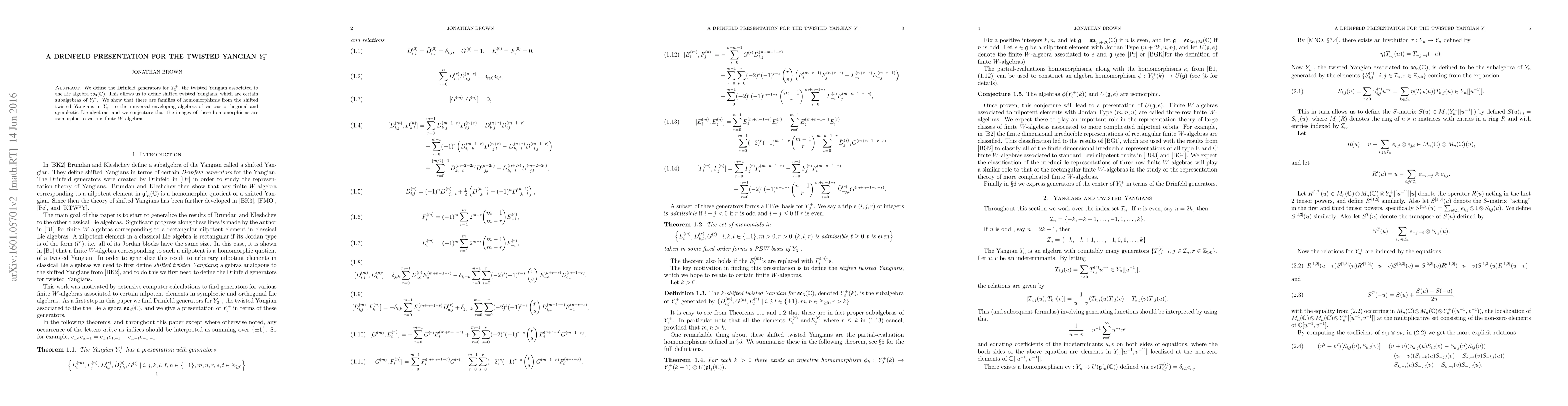 The paper defines Drinfeld generators for the twisted Yangian $Y_3^+$ linked to $\mathfrak{so}_3(\mathbb{C})$ and introduces shifted twisted Yangians as specific subalgebras. It also discusses homomorphisms from these subalgebras to universal enveloping algebras of orthogonal and symplectic Lie algebras, hypothesizing their images correspond to certain finite $W$-algebras.
