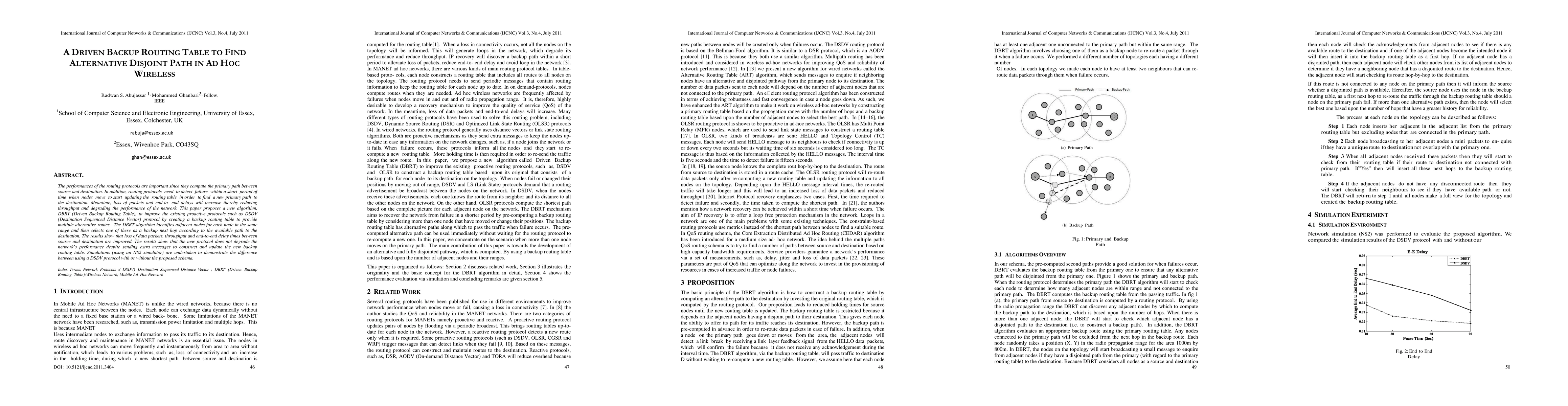 A new algorithm, DBRT, improves routing protocols in ad hoc wireless networks by creating a backup routing table to provide alternative routes, reducing packet loss, throughput, and end-to-end delay times.