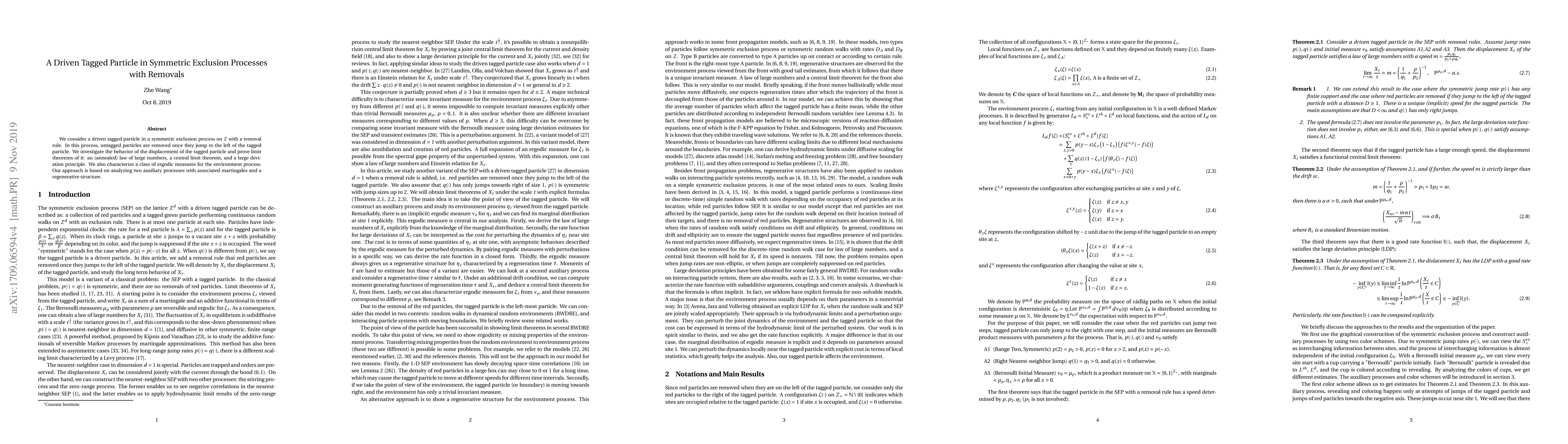 This paper studies a driven tagged particle in symmetric exclusion processes with removals, focusing on the tagged particle's displacement. It proves an (annealed) law of large numbers, a central limit theorem, and a large deviation principle for the particle's behavior, and characterizes ergodic measures for the environment process using auxiliary processes and martingales.