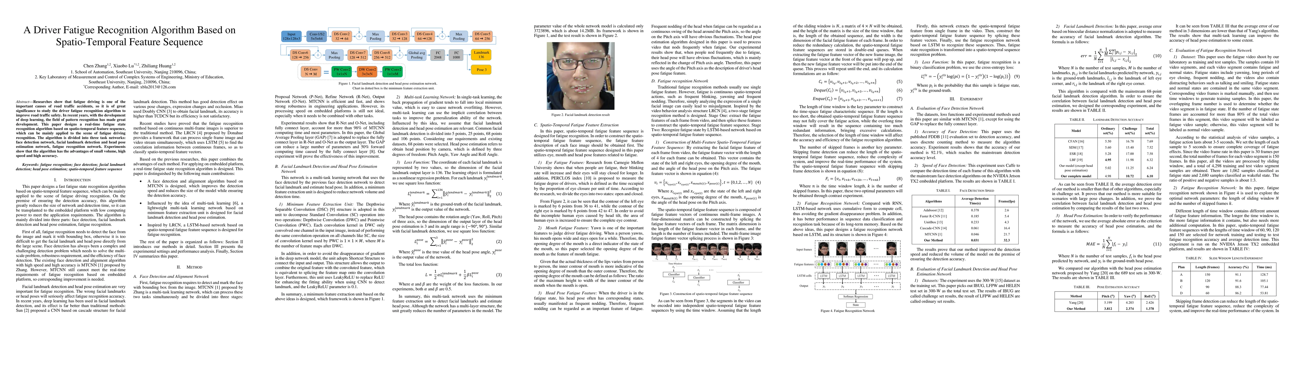 Researches show that fatigue driving is one of the important causes of road traffic accidents, so it is of great significance to study the driver fatigue recognition algorithm to improve road traffic safety. In recent years, with the development of deep learning, the field of pattern recognition has made great development. This paper designs a real-time fatigue state recognition algorithm based on spatio-temporal feature sequence, which can be mainly applied to the scene of fatigue driving recognition. The algorithm is divided into three task networks: face detection network, facial landmark detection and head pose estimation network, fatigue recognition network. Experiments show that the algorithm has the advantages of small volume, high speed and high accuracy.