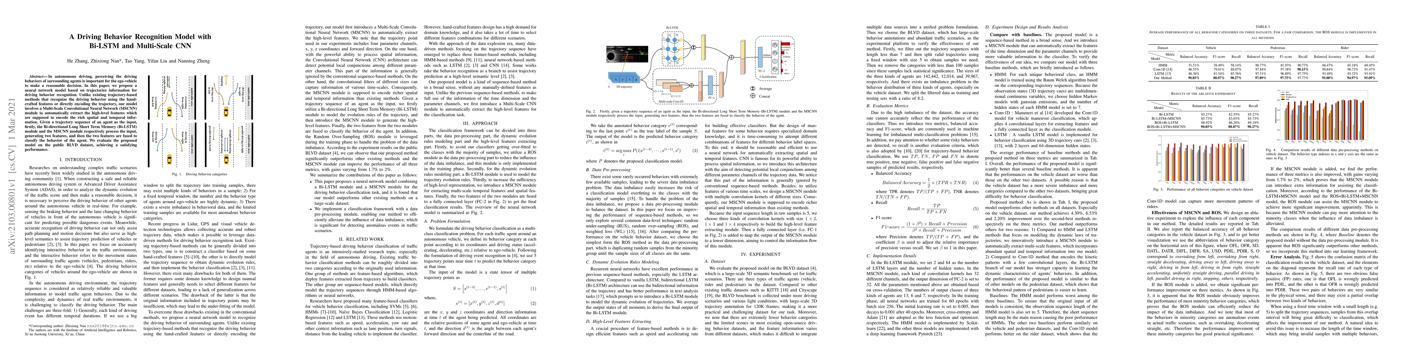 This paper proposes a neural network model combining Bi-LSTM and Multi-Scale CNN for driving behavior recognition using trajectory data. The MSCNN extracts high-level features automatically, while Bi-LSTM processes trajectory sequences, and both features are fused to classify driving behaviors, achieving good performance on the BLVD dataset.