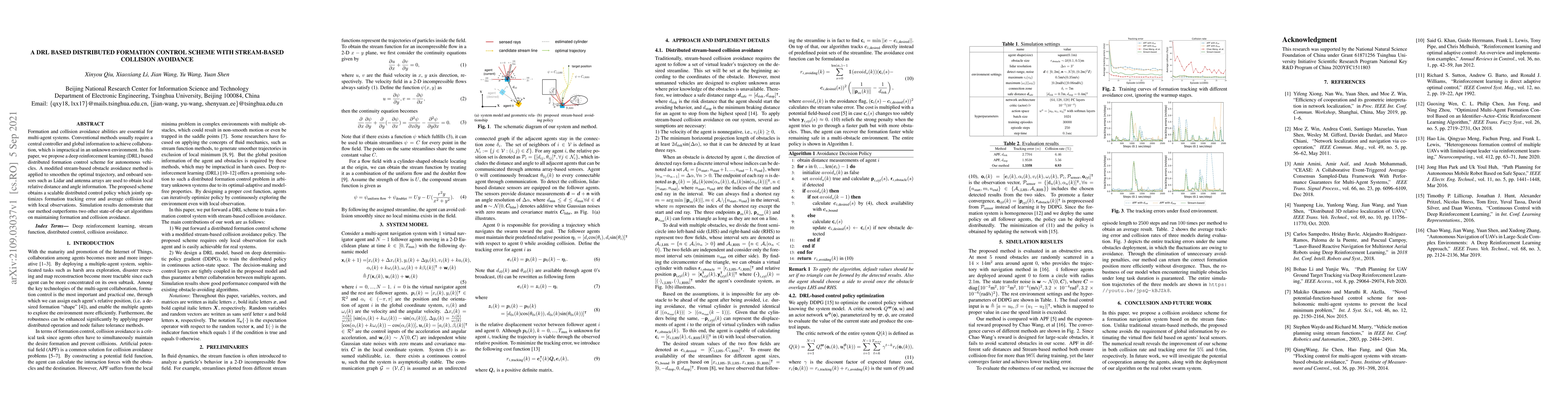 This paper proposes a distributed formation control scheme using deep reinforcement learning (DRL) for autonomous vehicles, incorporating a modified stream-based collision avoidance method. The approach leverages local sensor data to optimize formation tracking and collision avoidance, demonstrating superior performance compared to other algorithms in simulations.