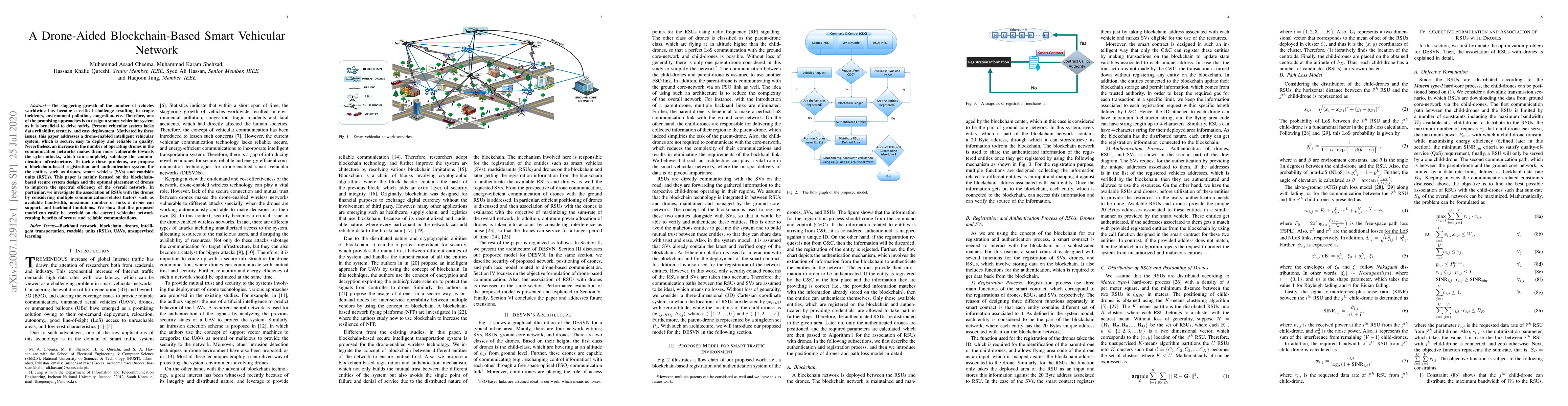 A drone-aided blockchain-based smart vehicular network is proposed to address security, reliability, and deployment issues in existing vehicle systems. The system uses a blockchain-based registration and authentication system for secure communication between drones, vehicles, and roadside units.