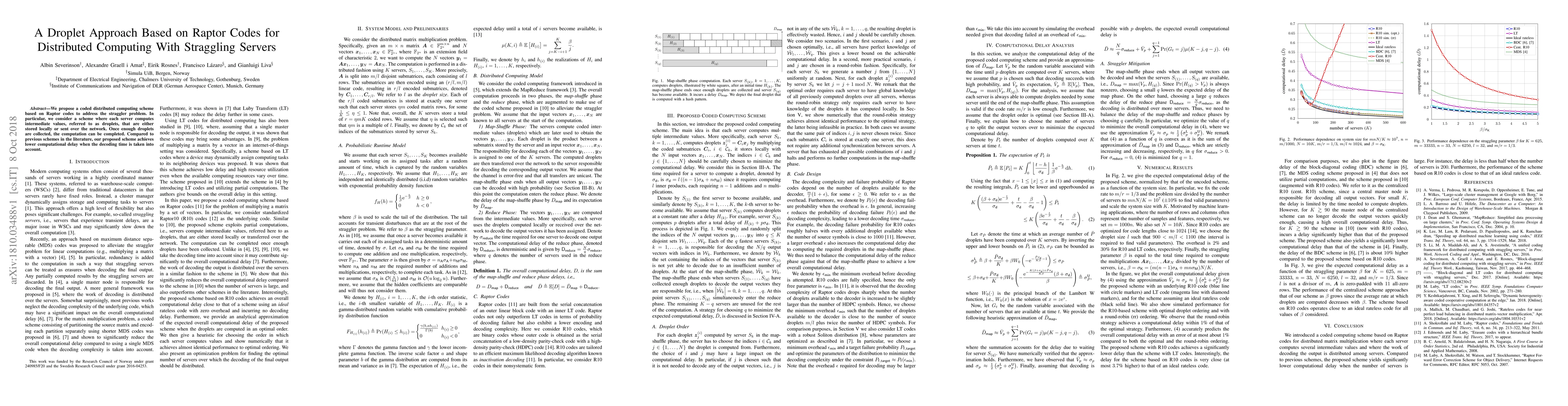 We propose a coded distributed computing scheme based on Raptor codes to address the straggler problem. In particular, we consider a scheme where each server computes intermediate values, referred to as droplets, that are either stored locally or sent over the network. Once enough droplets are collected, the computation can be completed. Compared to previous schemes in the literature, our proposed scheme achieves lower computational delay when the decoding time is taken into account.