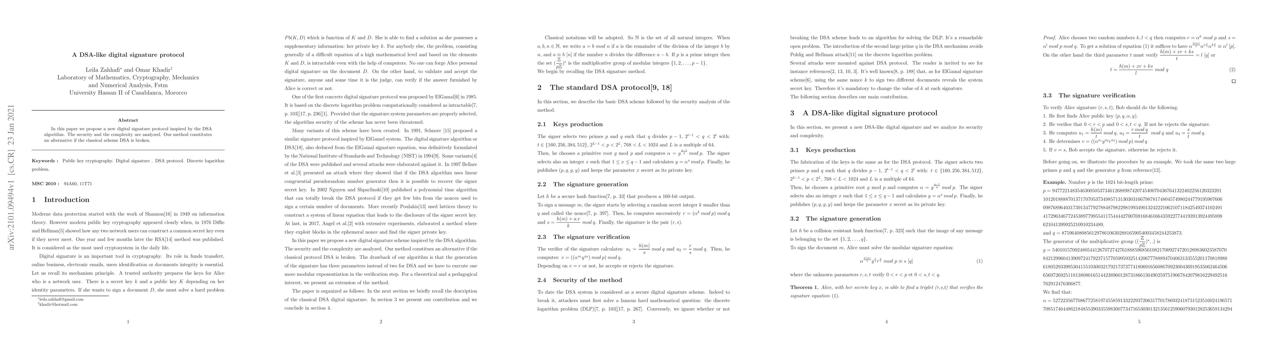 Summary: This paper introduces a novel digital signature protocol modeled after the DSA algorithm, with a focus on security and complexity analysis. It serves as an alternative should the traditional DSA scheme become compromised.