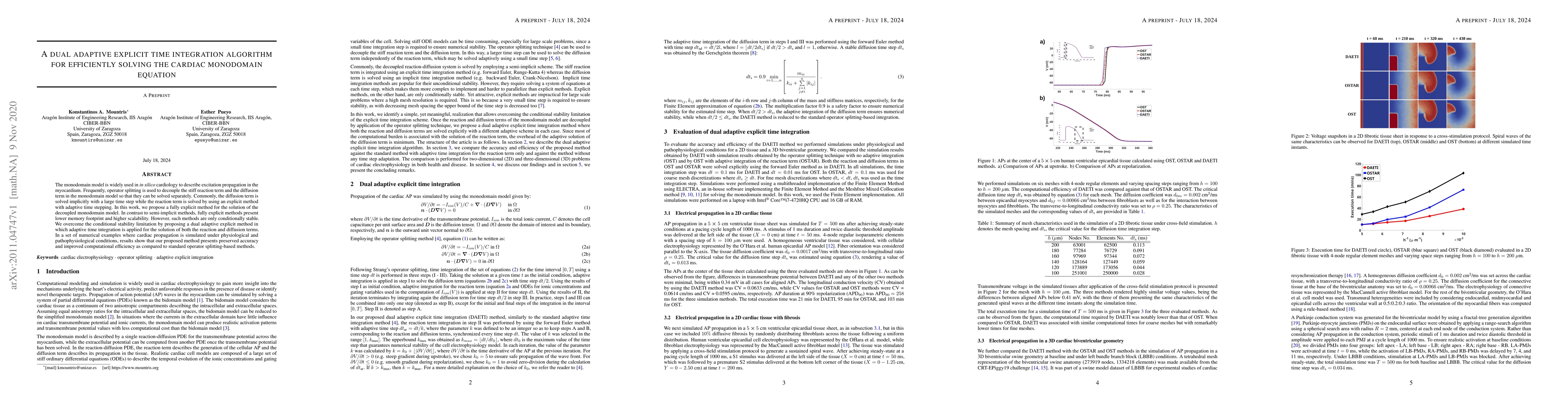 This paper proposes a dual adaptive explicit time integration algorithm for solving the cardiac monodomain equation, addressing the conditional stability of fully explicit methods by applying adaptive time integration to both reaction and diffusion terms, resulting in preserved accuracy and improved computational efficiency compared to standard operator splitting methods.