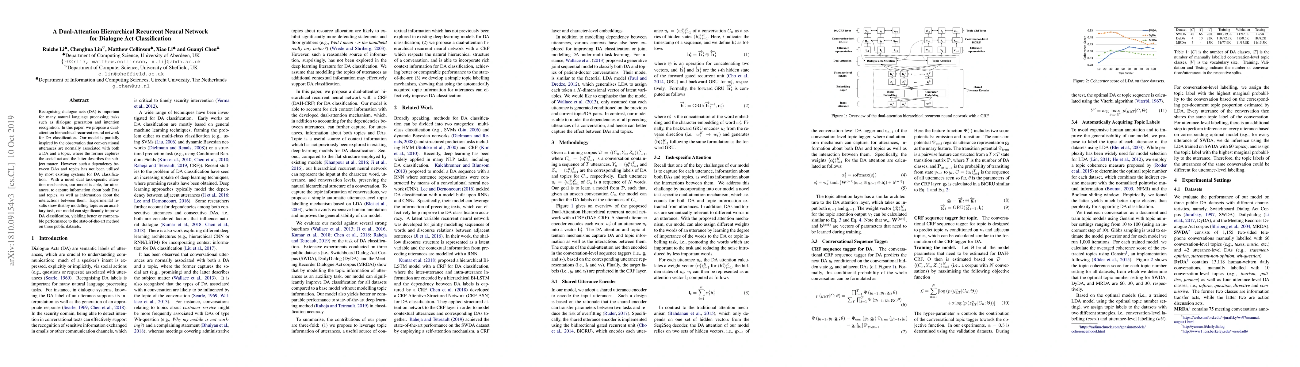 This paper proposes a dual-attention hierarchical recurrent neural network for dialogue act classification, leveraging a dual task-specific attention mechanism to capture both dialogue acts and topics. The model improves DA classification by incorporating topic information, achieving better or comparable results to state-of-the-art methods on three public datasets.