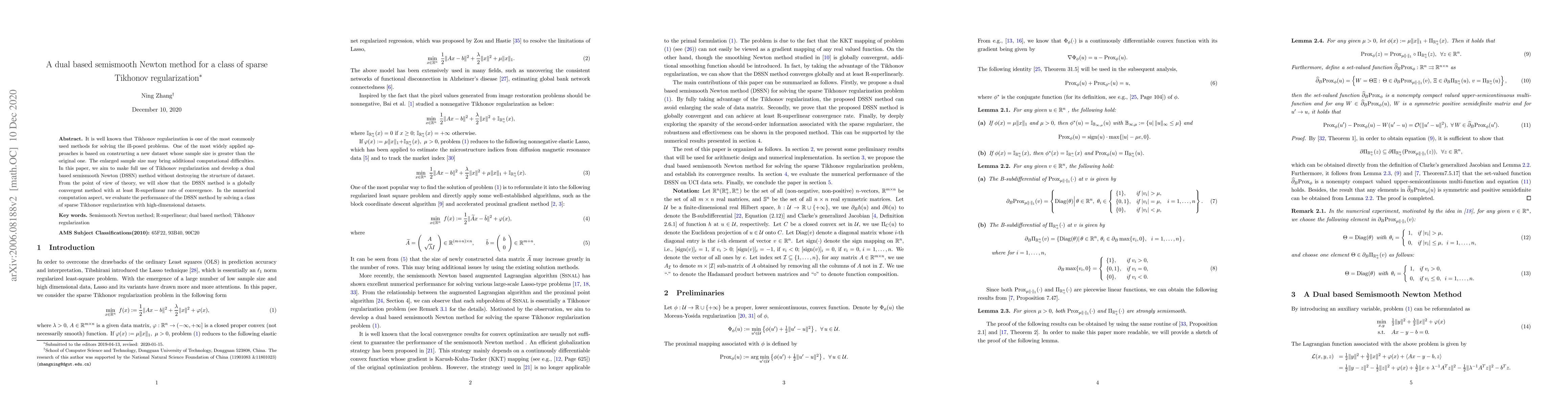 This paper proposes a dual based semismooth Newton method (DSSN) for sparse Tikhonov regularization to solve ill-posed problems without increasing dataset size. The DSSN method is shown to be globally convergent with R-superlinear convergence rate and is evaluated through numerical experiments on high-dimensional datasets.