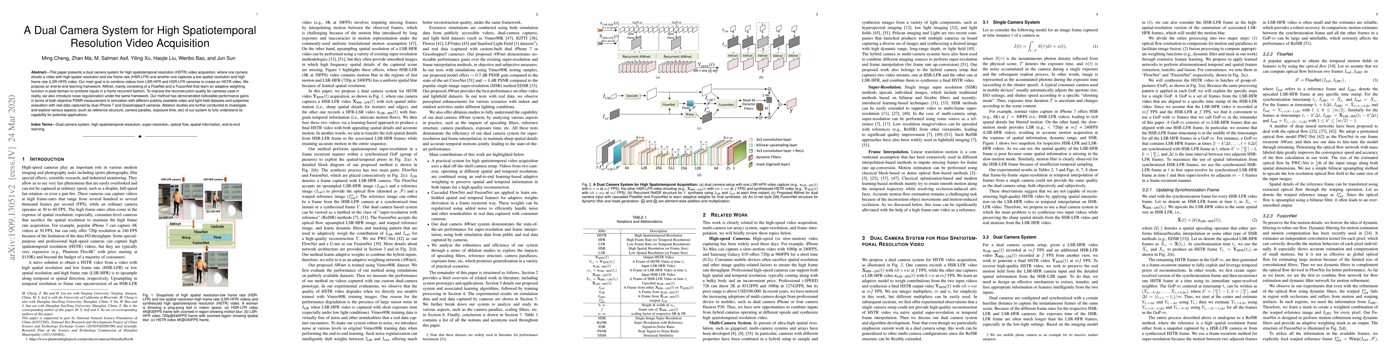The research presents a dual camera system for high spatiotemporal resolution (HSTR) video acquisition, combining high spatial resolution (HSR) low frame rate (LFR) and low spatial resolution (LSR) high frame rate (HFR) videos using an end-to-end learning framework, AWnet, which consists of FlowNet and FusionNet for adaptive weighting in pixel domain.