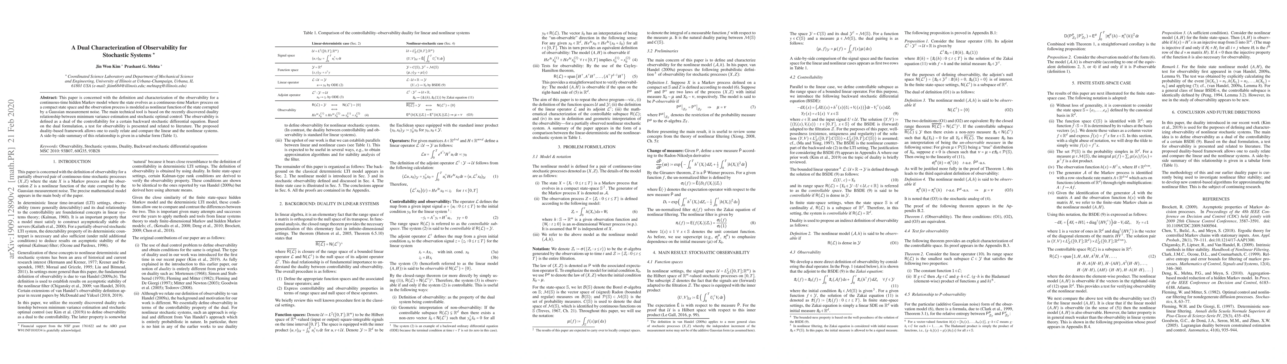 This paper is concerned with a characterization of the observability for a continuous-time hidden Markov model where the state evolves as a general continuous-time Markov process and the observation process is modeled as nonlinear function of the state corrupted by the Gaussian measurement noise. The main technical tool is based on the recently discovered duality relationship between minimum variance estimation and stochastic optimal control: The observability is defined as a dual of the controllability for a certain backward stochastic differential equation. Based on the dual formulation, a test for observability is presented and related to literature. The proposed duality-based framework allows one to easily relate and compare the linear and the nonlinear systems. A side-by-side summary of this relationship is given in a tabular form (Table~1)