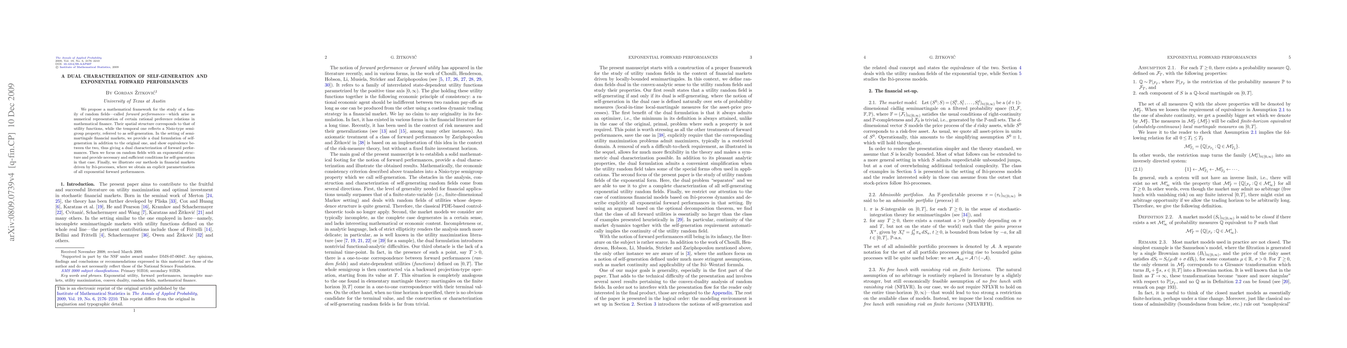 We propose a mathematical framework for the study of a family of random fields--called forward performances--which arise as numerical representation of certain rational preference relations in mathematical finance. Their spatial structure corresponds to that of utility functions, while the temporal one reflects a Nisio-type semigroup property, referred to as self-generation. In the setting of semimartingale financial markets, we provide a dual formulation of self-generation in addition to the original one, and show equivalence between the two, thus giving a dual characterization of forward performances. Then we focus on random fields with an exponential structure and provide necessary and sufficient conditions for self-generation in that case. Finally, we illustrate our methods in financial markets driven by It\^o-processes, where we obtain an explicit parametrization of all exponential forward performances.