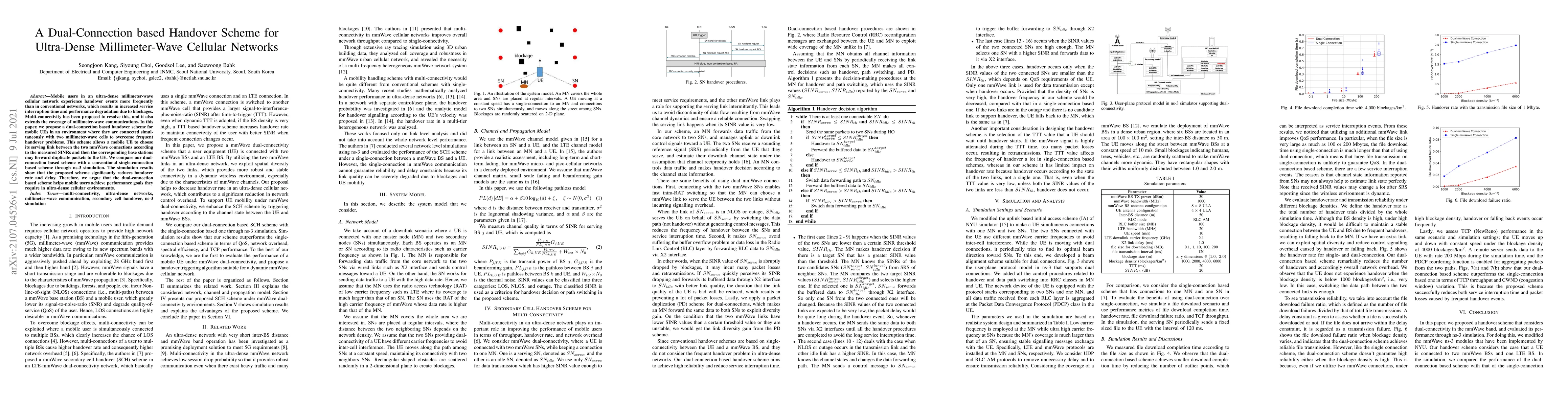 This paper proposes a dual-connection based handover scheme for ultra-dense millimeter-wave networks to reduce frequent handovers and delays, significantly improving performance compared to a single-connection scheme, as demonstrated by ns-3 simulations.