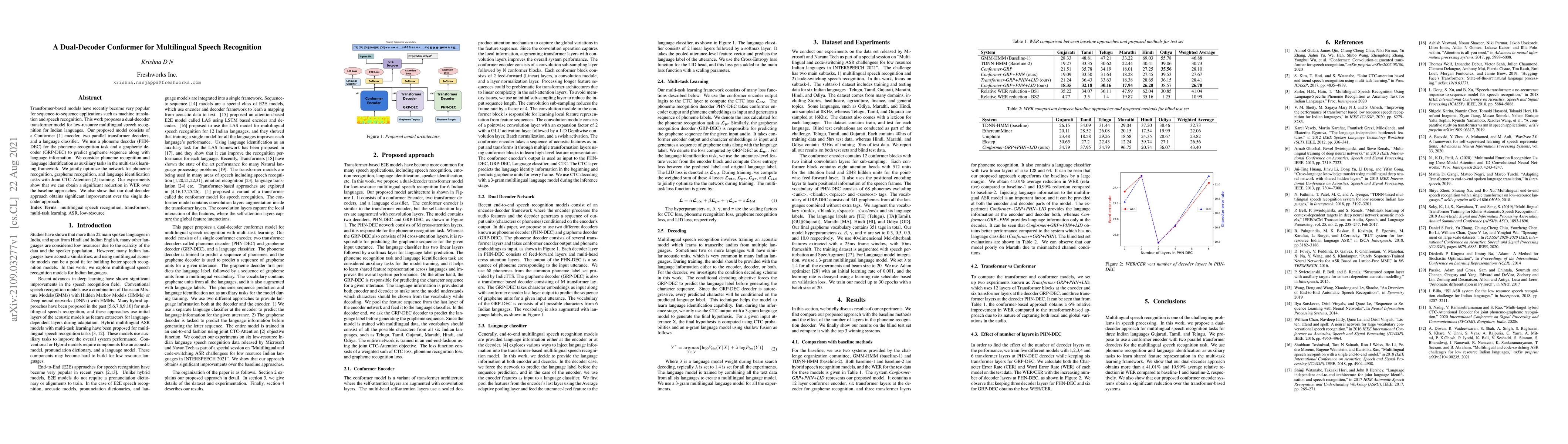 This research introduces a dual-decoder transformer model with a Conformer encoder for multilingual speech recognition, achieving lower word error rates (WER) compared to baselines. The dual-decoder approach, using separate phoneme and grapheme decoders, outperforms single decoder methods in low-resource Indian languages.