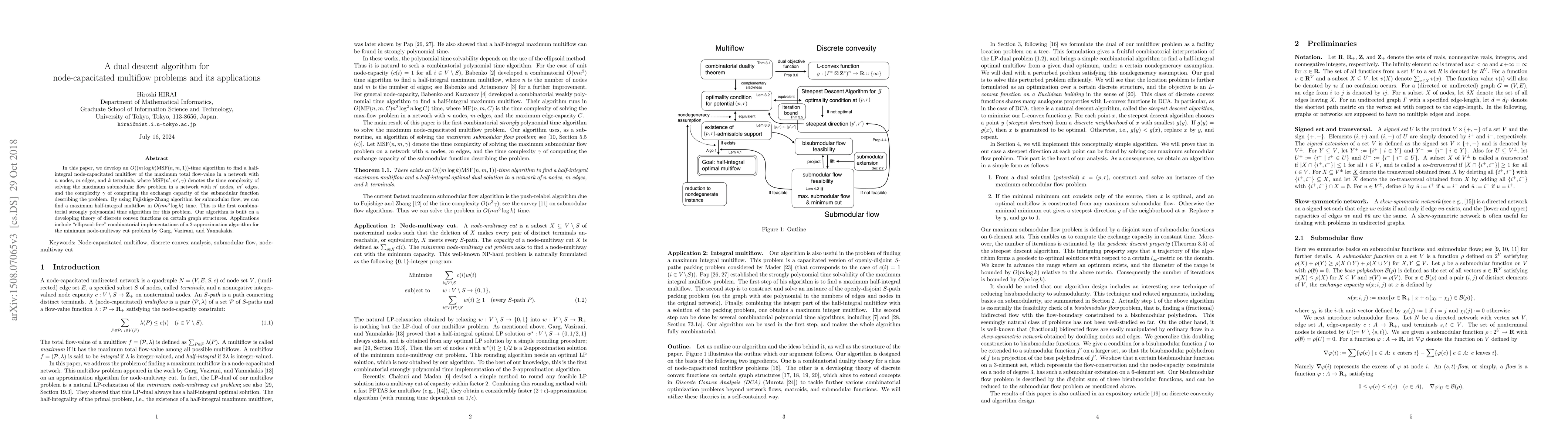 In this paper, we develop an $O((m \log k) {\rm MSF} (n,m,1))$-time algorithm to find a half-integral node-capacitated multiflow of the maximum total flow-value in a network with $n$ nodes, $m$ edges, and $k$ terminals, where ${\rm MSF} (n',m',\gamma)$ denotes the time complexity of solving the maximum submodular flow problem in a network with $n'$ nodes, $m'$ edges, and the complexity $\gamma$ of computing the exchange capacity of the submodular function describing the problem. By using Fujishige-Zhang algorithm for submodular flow, we can find a maximum half-integral multiflow in $O(m n^3 \log k)$ time. This is the first combinatorial strongly polynomial time algorithm for this problem. Our algorithm is built on a developing theory of discrete convex functions on certain graph structures. Applications include "ellipsoid-free" combinatorial implementations of a 2-approximation algorithm for the minimum node-multiway cut problem by Garg, Vazirani, and Yannakakis.