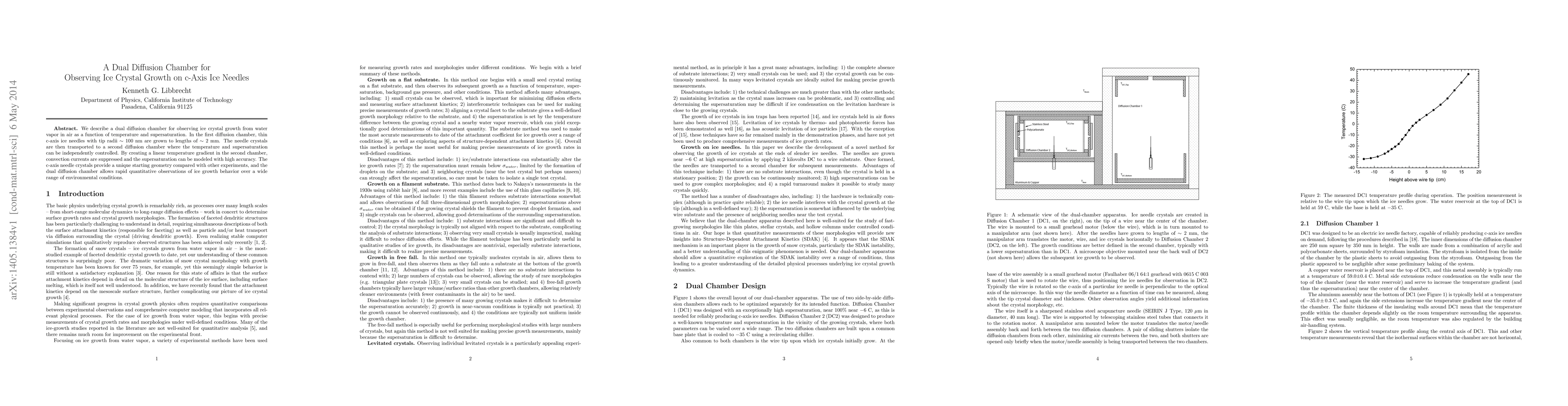 We describe a dual diffusion chamber for observing ice crystal growth from water vapor in air as a function of temperature and supersaturation. In the first diffusion chamber, thin c-axis ice needles with tip radii ~100 nm are grown to lengths of ~2 mm. The needle crystals are then transported to a second diffusion chamber where the temperature and supersaturation can be independently controlled. By creating a linear temperature gradient in the second chamber, convection currents are suppressed and the supersaturation can be modeled with high accuracy. The c-axis needle crystals provide a unique starting geometry compared with other experiments, and the dual diffusion chamber allows rapid quantitative observations of ice growth behavior over a wide range of environmental conditions.