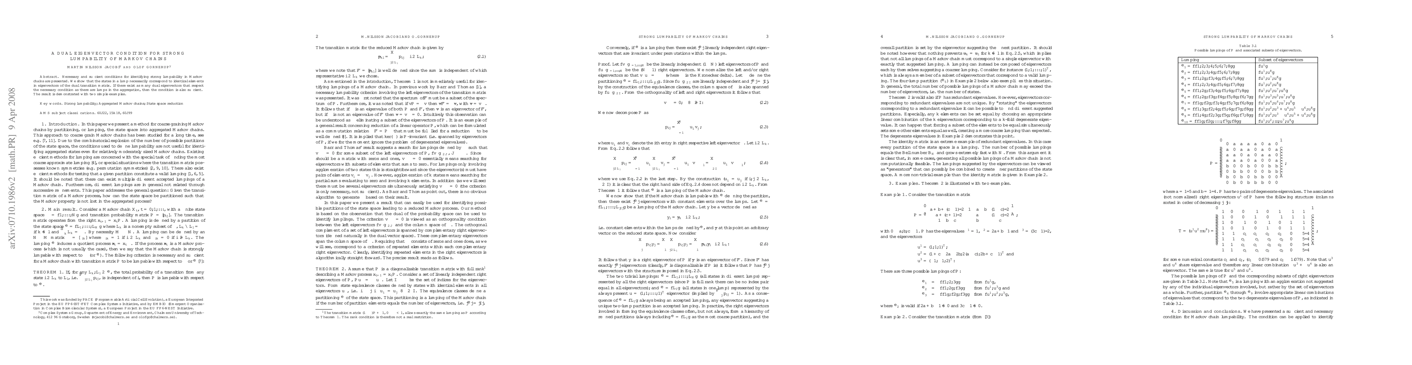 This paper presents necessary and sufficient conditions for strong lumpability in Markov chains, showing that states in a lump correspond to identical elements in eigenvectors of the dual transition matrix, with sufficiency proven when the number of dual eigenvectors matches the number of lumps.
