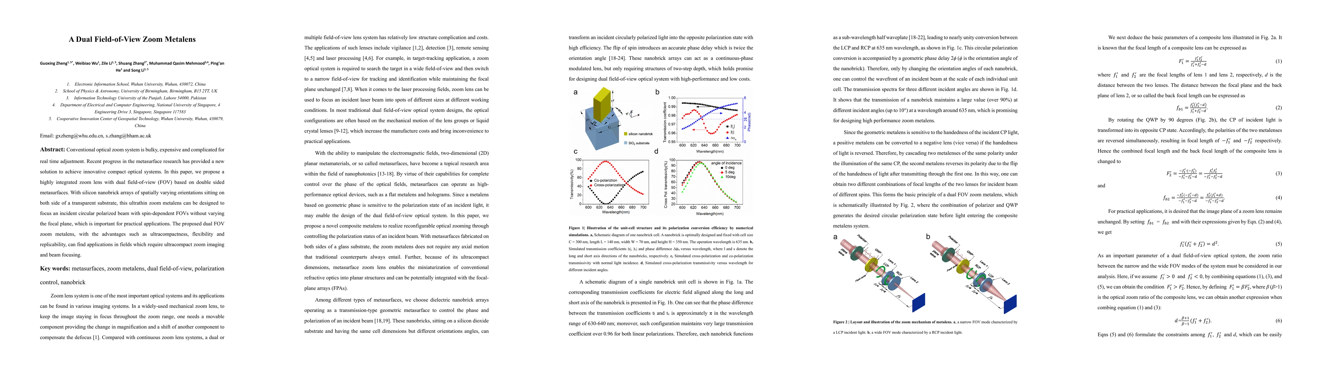 This paper proposes a compact, dual field-of-view zoom metalens based on double-sided metasurfaces, utilizing silicon nanobrick arrays for spin-dependent focusing without changing the focal plane, offering advantages like ultracompactness and flexibility for practical applications.