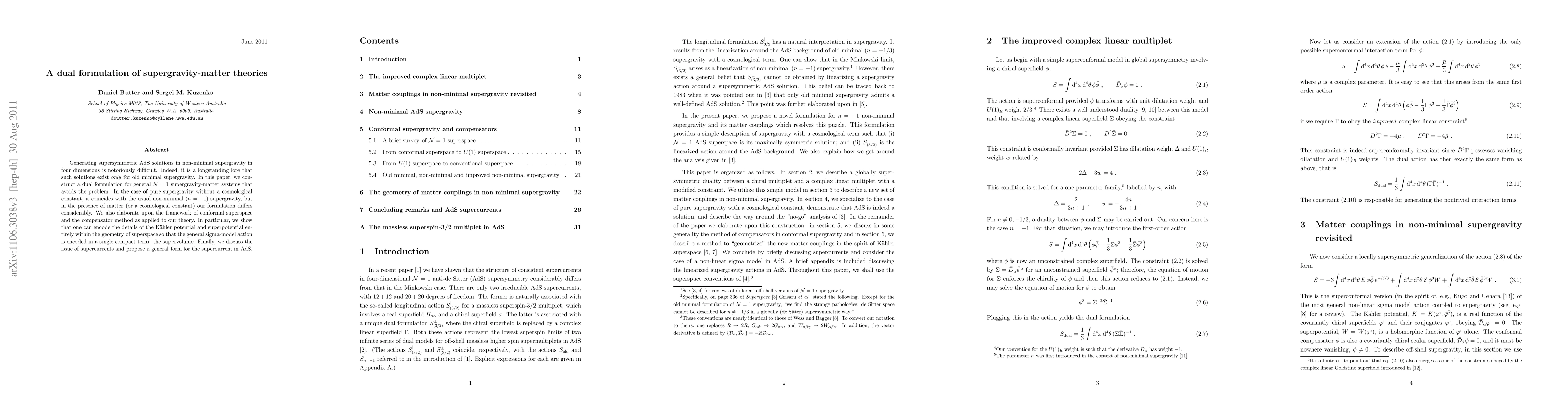 This paper introduces a dual formulation for general N=1 supergravity-matter systems that simplifies the generation of supersymmetric AdS solutions, differing significantly from traditional non-minimal formulations in the presence of matter or cosmological constants. The authors utilize conformal superspace and the compensator method to encode the Kahler potential and superpotential within the geometry of superspace, leading to a compact supervolume term for the sigma-model action.