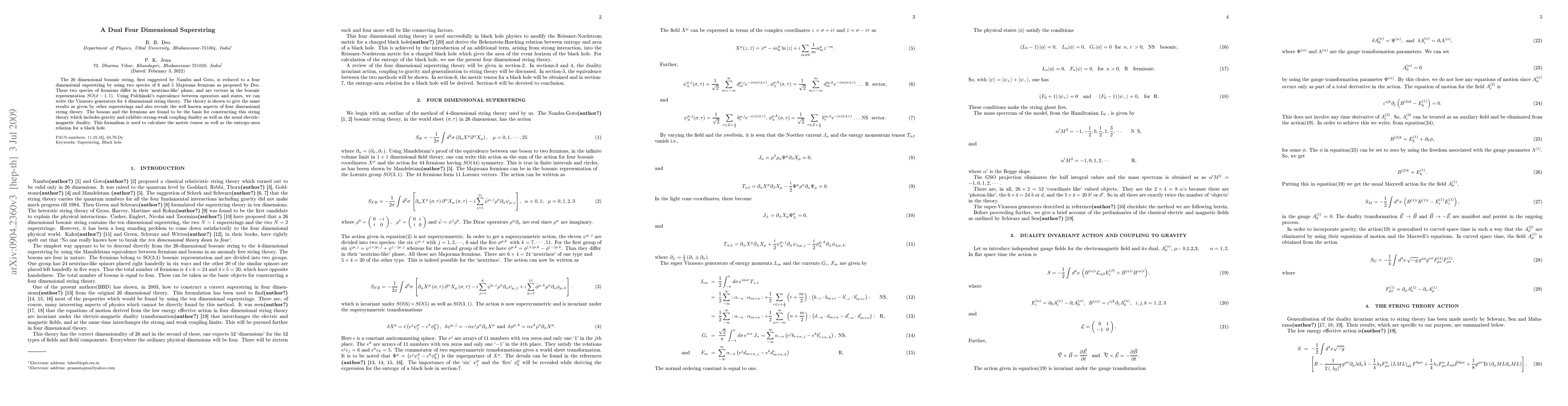 The 26 dimensional bosonic string, first suggested by Nambu and Goto, is reduced to a four dimensional superstring by using two species of 6 and 5 Majorana fermions as proposed by Deo. These two species of fermions differ in their 'neutrino-like' phase, and are vectors in the bosonic representation SO(d-1,1).Using Polchinski's equivalence between operators and states, we can write the Virasoro generators for 4 dimensional string theory. The theory is shown to give the same results as given by other superstrings and also reveals the well known aspects of four dimensional string theory.The bosons and the fermions are found to be the basis for constructing this string theory which includes gravity and exhibits strong-weak coupling duality as well as the usual electric-magnetic duality. This formalism is used to calculate the metric tensor as well as the entropy area relation for a black hole.
