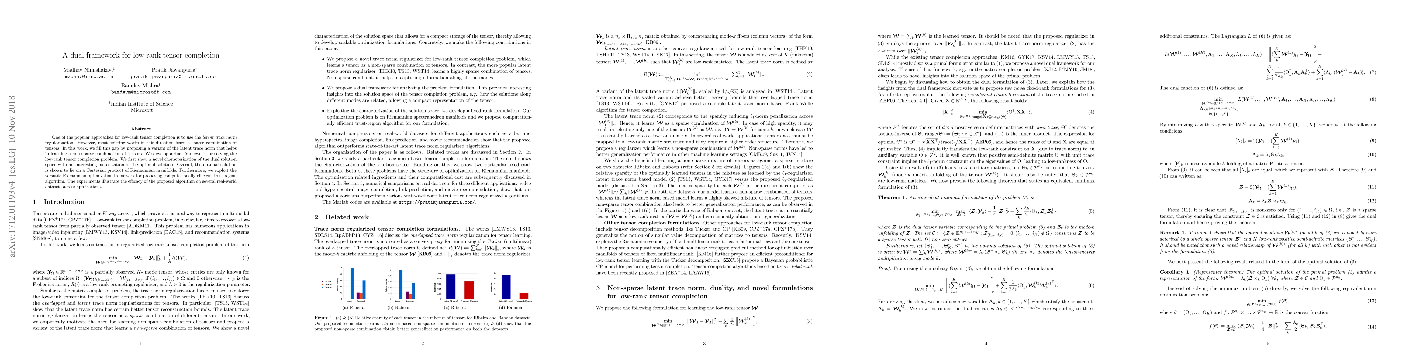 This paper proposes a novel dual framework for low-rank tensor completion using a non-sparse latent trace norm regularization. It introduces a factorization of the dual solution space and leverages Riemannian optimization for an efficient trust region algorithm, demonstrating effectiveness on real-world datasets.