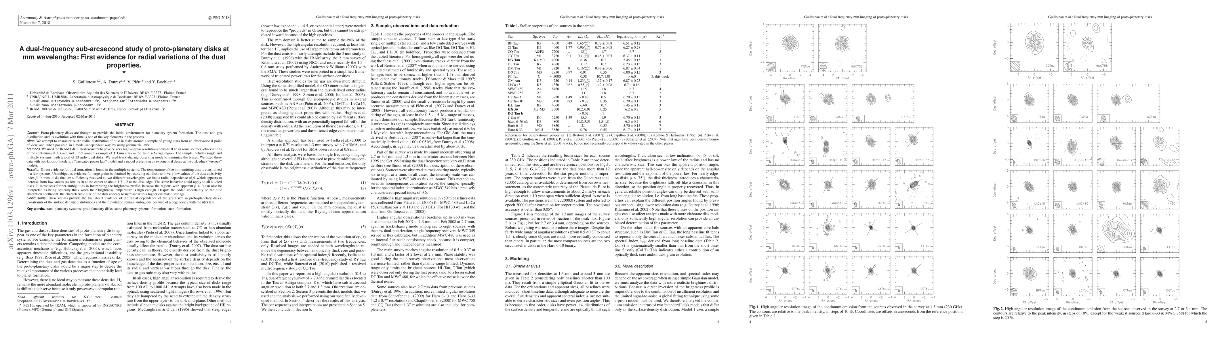 (Abridged) We attempt to characterize the radial distribution of dust in disks around a sample of young stars from an observational point of view, and, when possible, in a model-independent way, by using parametric laws. We used the IRAM PdBI interferometer to provide very high angular resolution (down to 0.4" in some sources) observations of the continuum at 1.3 mm and 3 mm around a sample of T Tauri stars in the Taurus-Auriga region. The sample includes single and multiple systems, with a total of 23 individual disks. We used track-sharing observing mode to minimize the biases. We fitted these data with two kinds of models: a "truncated power law" model and a model presenting an exponential decay at the disk edge ("viscous" model). ect evidence for tidal truncation is found in the multiple systems. The temperature of the mm-emitting dust is constrained in a few systems. Unambiguous evidence for large grains is obtained by resolving out disks with very low values of the dust emissivity index Beta. In most disks that are sufficiently resolved at two different wavelengths, we find a radial dependence of Beta, which appears to increase from low values (as low as 0) at the center to about 1.7 -- 2 at the disk edge. The same behavior could apply to all studied disks. It introduces further ambiguities in interpreting the brightness profile, because the regions with apparent Beta = 0 can also be interpreted as being optically thick when their brightness temperature is high enough. Despite the added uncertainty on the dust absorption coefficient, the characteristic size of the disk appears to increase with a higher estimated star age. These results provide the first direct evidence of the radial dependence of the grain size in proto-planetary disks.