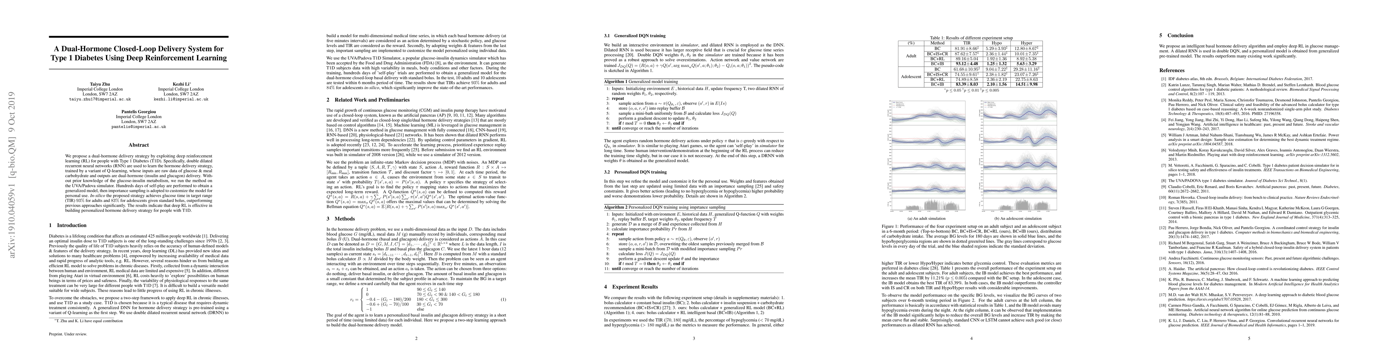This paper proposes a dual-hormone closed-loop delivery system for Type 1 Diabetes using deep reinforcement learning, with an RNN trained via Q-learning to optimize insulin and glucagon delivery. The method achieves high glucose time in target range (TIR) in simulations, outperforming previous strategies.