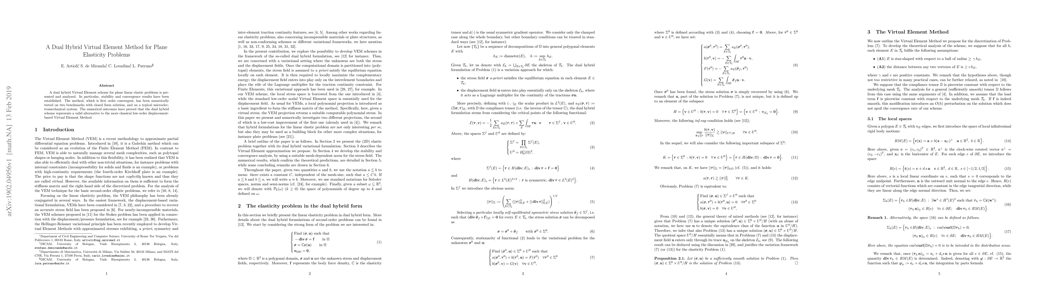 This paper introduces a dual hybrid Virtual Element Method for plane elasticity problems, demonstrating stability and convergence. Numerical tests show first-order convergence and validate the method as a viable alternative to traditional low-order displacement-based methods.