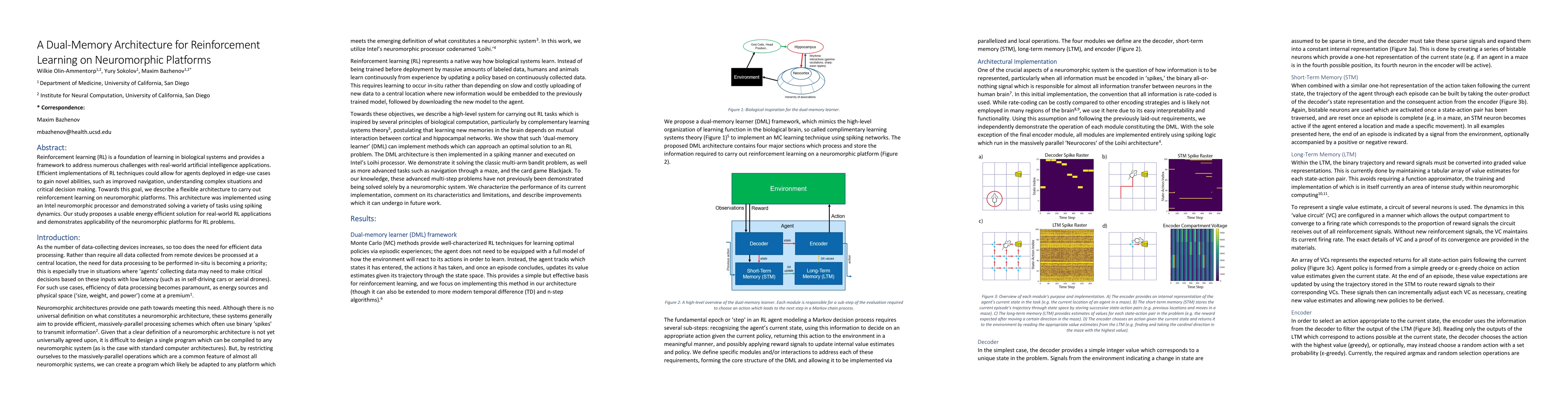 This paper presents a dual-memory architecture for reinforcement learning on neuromorphic platforms, implemented on an Intel neuromorphic processor, which efficiently solves various tasks using spiking dynamics, showcasing the potential of neuromorphic systems for real-world RL applications.