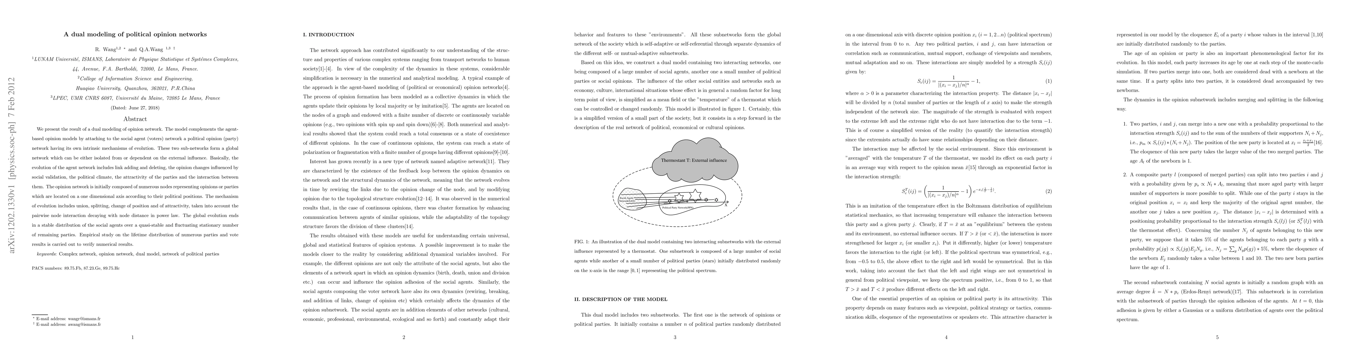 We present the result of a dual modeling of opinion network. The model complements the agent-based opinion models by attaching to the social agent (voters) network a political opinion (party) network having its own intrinsic mechanisms of evolution. These two sub-networks form a global network which can be either isolated from or dependent on the external influence. Basically, the evolution of the agent network includes link adding and deleting, the opinion changes influenced by social validation, the political climate, the attractivity of the parties and the interaction between them. The opinion network is initially composed of numerous nodes representing opinions or parties which are located on a one dimensional axis according to their political positions. The mechanism of evolution includes union, splitting, change of position and of attractivity, taken into account the pairwise node interaction decaying with node distance in power law. The global evolution ends in a stable distribution of the social agents over a quasi-stable and fluctuating stationary number of remaining parties. Empirical study on the lifetime distribution of numerous parties and vote results is carried out to verify numerical results.