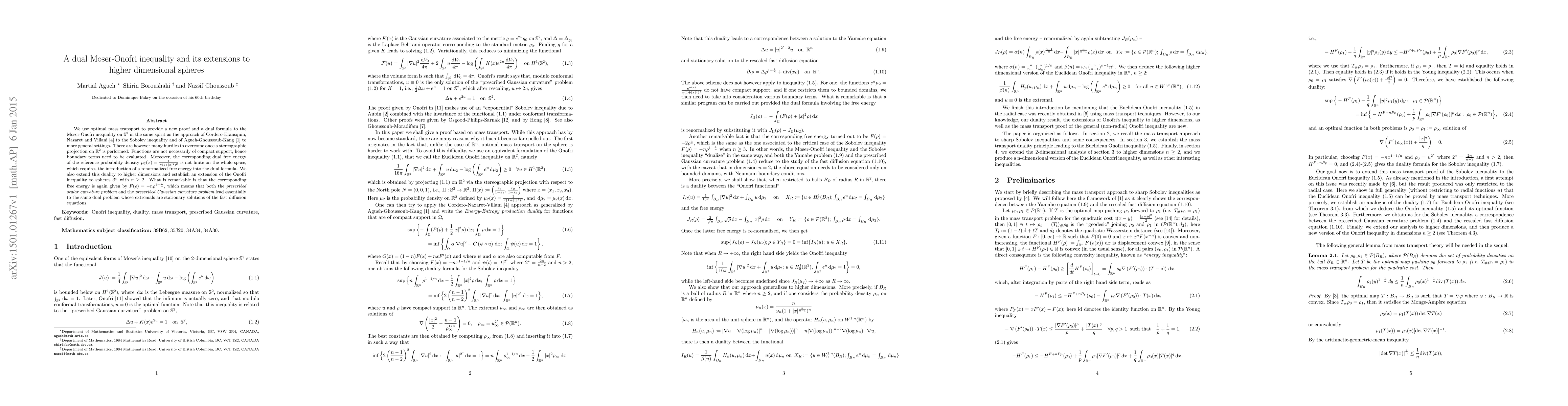 We use optimal mass transport to provide a new proof and a dual formula to the Moser-Onofri inequality on $\s^2$ in the same spirit as the approach of Cordero-Erausquin, Nazaret and Villani to the Sobolev inequality and of Agueh-Ghoussoub-Kang to more general settings. There are however many hurdles to overcome once a stereographic projection on $\R^2$ is performed: Functions are not necessarily of compact support, hence boundary terms need to be evaluated. Moreover, the corresponding dual free energy of the reference probability density $\mu_2(x)=\frac{1}{\pi(1+|x|^2)^2}$ is not finite on the whole space, which requires the introduction of a renormalized free energy into the dual formula. We also extend this duality to higher dimensions and establish an extension of the Onofri inequality to spheres $\s^n$ with $n\geq 2$. What is remarkable is that the corresponding free energy is again given by $F(\rho)=-n\rho^{1-\frac{1}{n}}$, which means that both the {\it prescribed scalar curvature problem} and the {\it prescribed Gaussian curvature problem} lead essentially to the same dual problem whose extremals are stationary solutions of the fast diffusion equations.