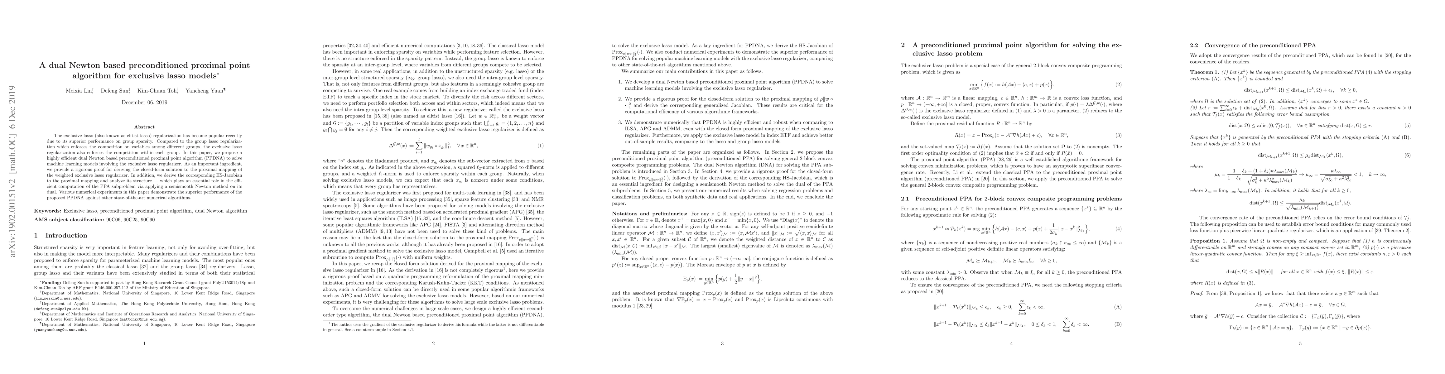 This paper proposes a dual Newton based preconditioned proximal point algorithm (PPDNA) for solving exclusive lasso models, which enforces both inter-group and intra-group variable competition. The authors provide a closed-form solution to the proximal mapping and demonstrate superior performance through numerical experiments compared to other algorithms.