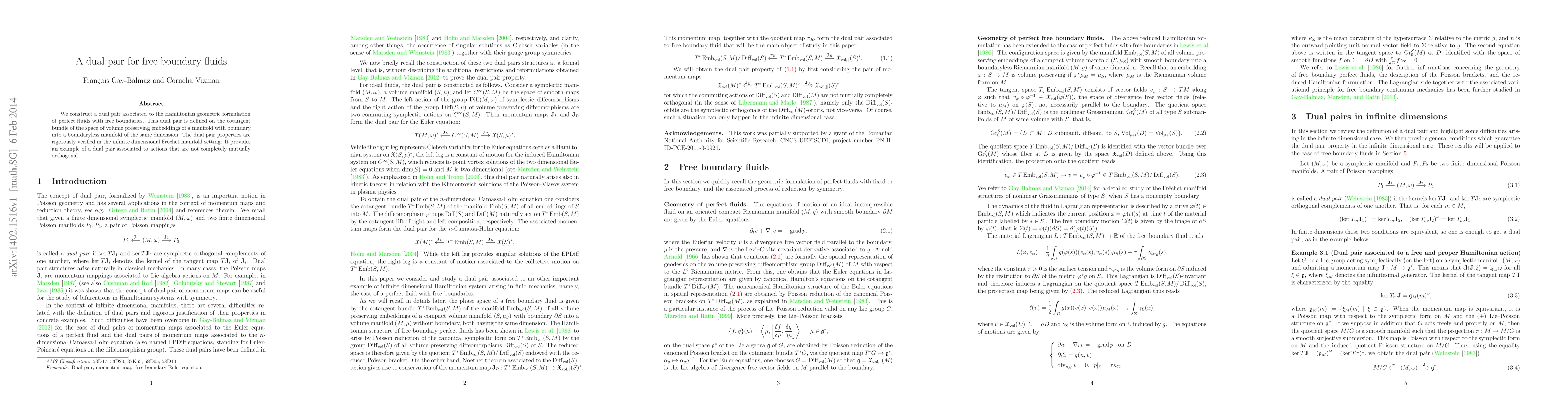 This research constructs a dual pair for free boundary fluids using a Hamiltonian geometric formulation, verified in an infinite dimensional manifold setting. It offers an example of non-completely orthogonal action dual pairs.