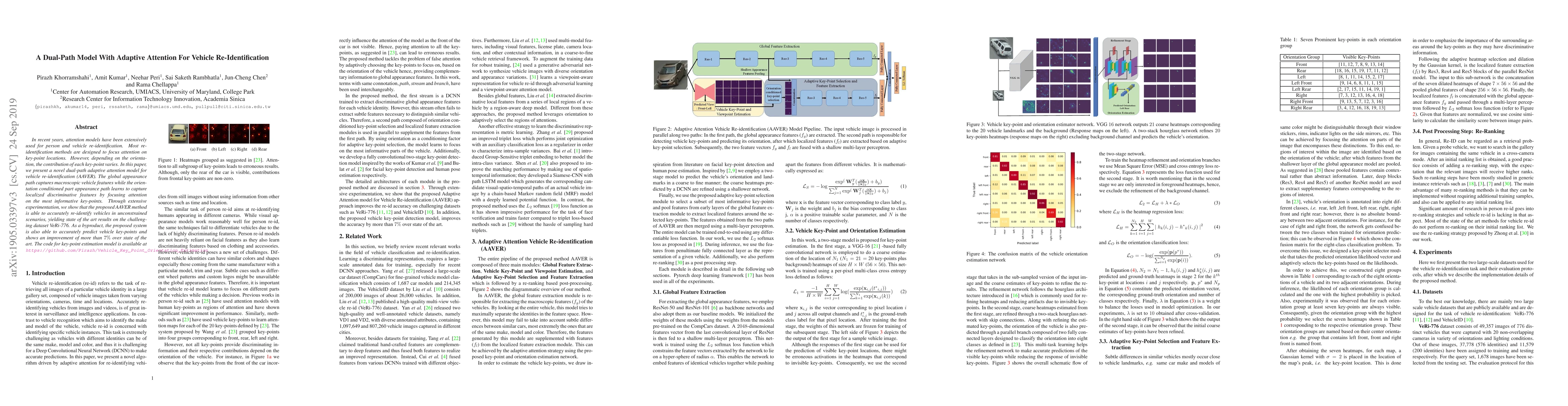 This paper introduces a dual-path adaptive attention model (AAVER) for vehicle re-identification, combining global appearance and orientation-conditioned part appearance to focus on key features. The method achieves state-of-the-art results on the VeRi-776 dataset and also improves key-point prediction by over 7%.