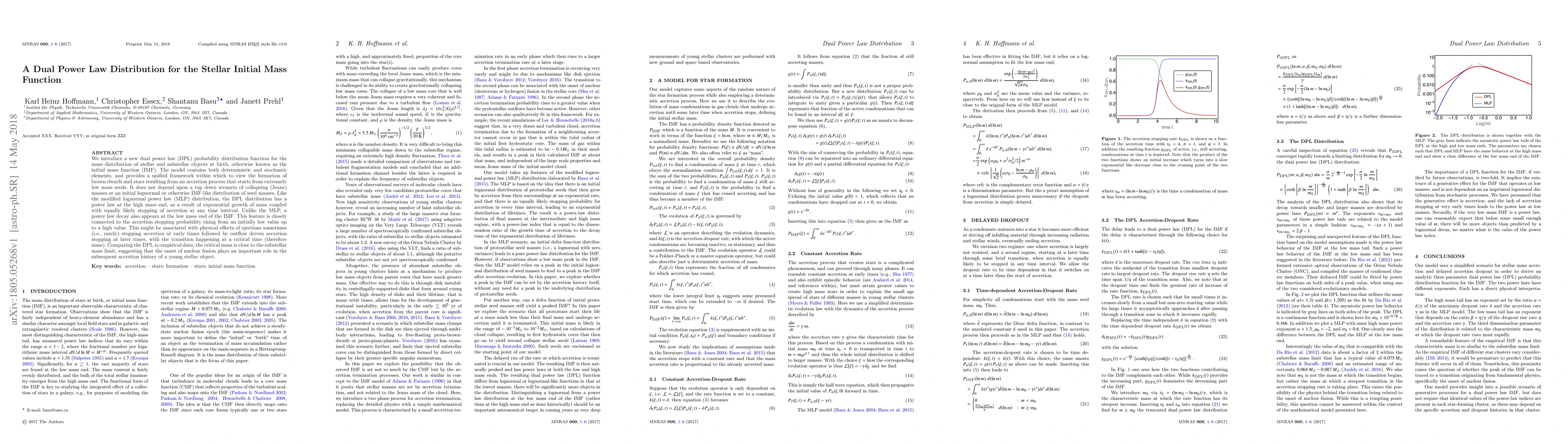 The paper proposes a dual power law distribution to model the initial mass function of stars and substellar objects, featuring both high and low mass power law decays. This model accounts for the formation process through accretion without relying on traditional collapsing mass scenarios.