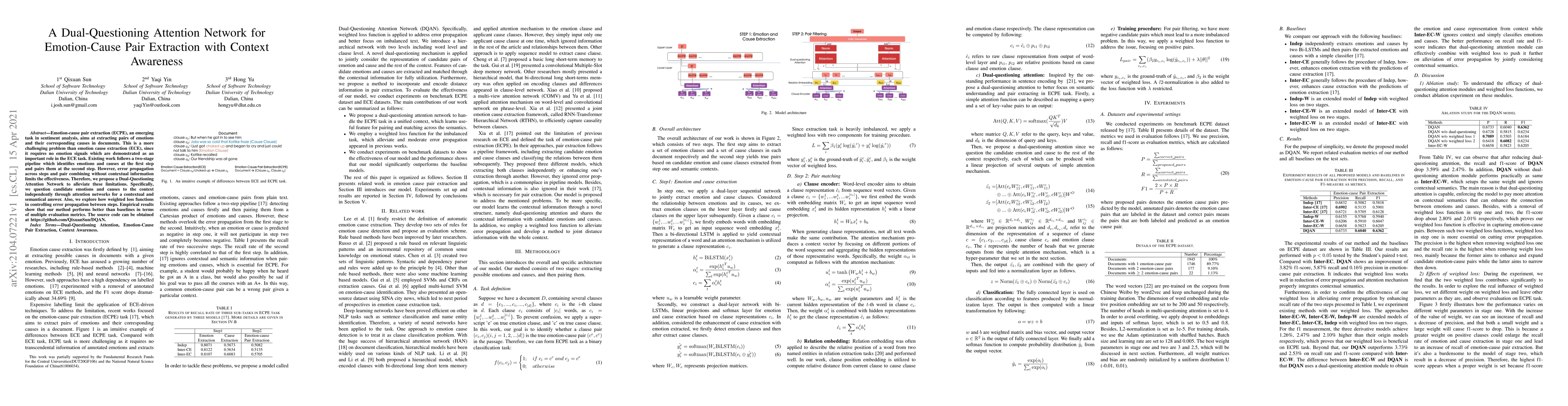 Emotion-cause pair extraction (ECPE), an emerging task in sentiment analysis, aims at extracting pairs of emotions and their corresponding causes in documents. This is a more challenging problem than emotion cause extraction (ECE), since it requires no emotion signals which are demonstrated as an important role in the ECE task. Existing work follows a two-stage pipeline which identifies emotions and causes at the first step and pairs them at the second step. However, error propagation across steps and pair combining without contextual information limits the effectiveness. Therefore, we propose a Dual-Questioning Attention Network to alleviate these limitations. Specifically, we question candidate emotions and causes to the context independently through attention networks for a contextual and semantical answer. Also, we explore how weighted loss functions in controlling error propagation between steps. Empirical results show that our method performs better than baselines in terms of multiple evaluation metrics. The source code can be obtained at https://github.com/QixuanSun/DQAN.