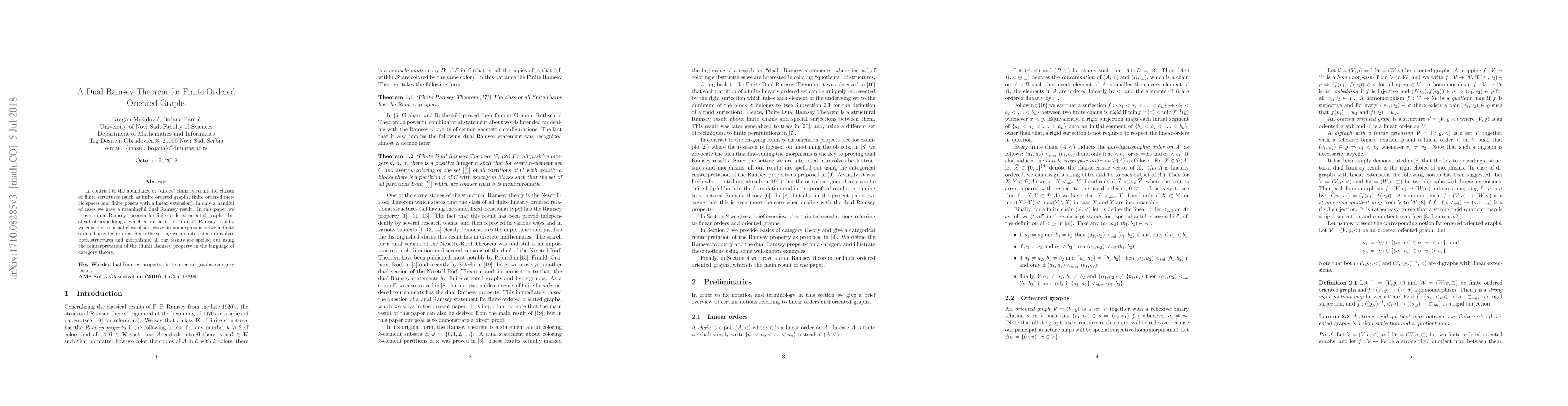 In contrast to the abundance of "direct" Ramsey results for classes of finite structures (such as finite ordered graphs, finite ordered metric spaces and finite posets with a linear extension), in only a handful of cases we have a meaningful dual Ramsey result. In this paper we prove a dual Ramsey theorem for finite ordered oriented graphs. Instead of embeddings, which are crucial for "direct" Ramsey results, we consider a special class of surjective homomorphisms between finite ordered oriented graphs. Since the setting we are interested in involves both structures and morphisms, all our results are spelled out using the reinterpretation of the (dual) Ramsey property in the language of category theory.
