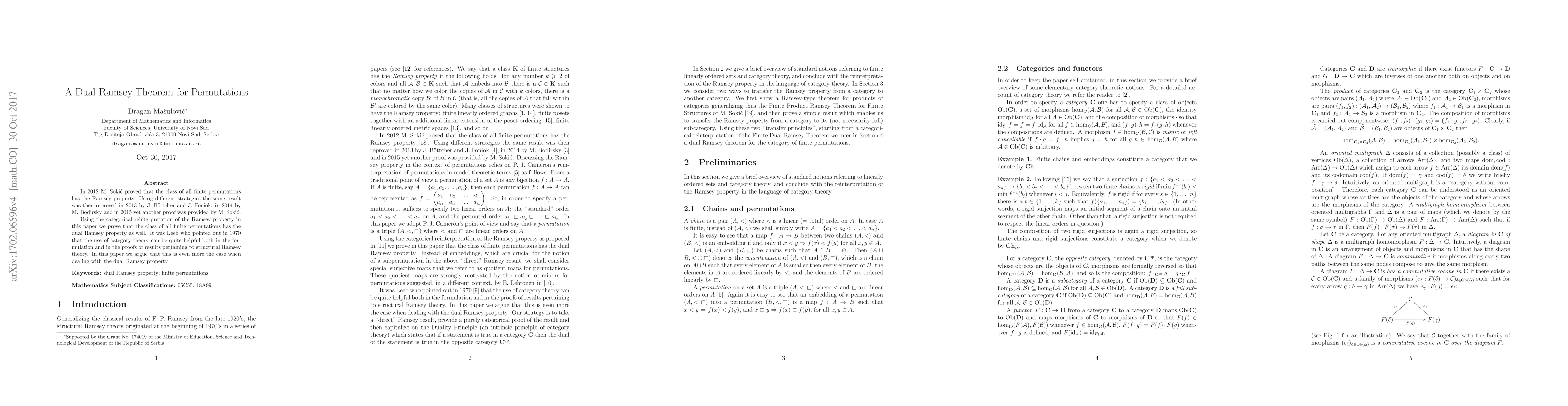 This paper proves that the class of all finite permutations possesses the dual Ramsey property using a categorical reinterpretation. It builds on the foundational work of Leeb in 1970, which highlighted the utility of category theory in structural Ramsey theory.