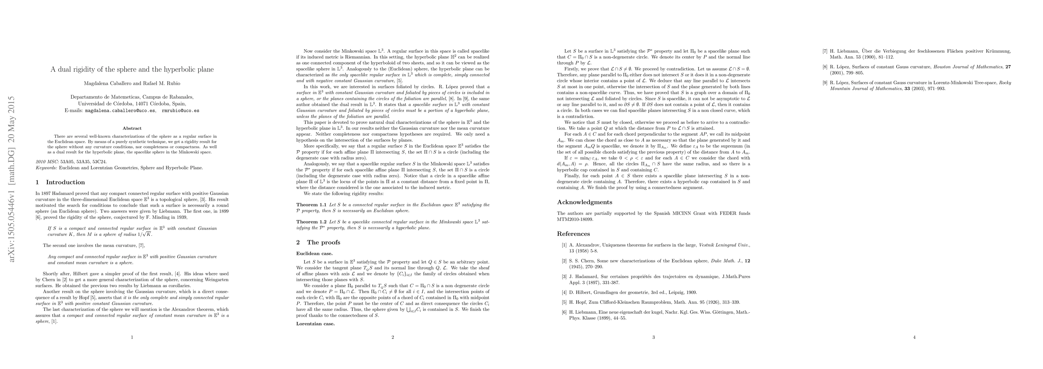 There are several well-known characterizations of the sphere as a regular surface in the Euclidean space. By means of a purely synthetic technique, we get a rigidity result for the sphere without any curvature conditions, nor completeness or compactness. As well as a dual result for the hyperbolic plane, the spacelike sphere in the Minkowski space.