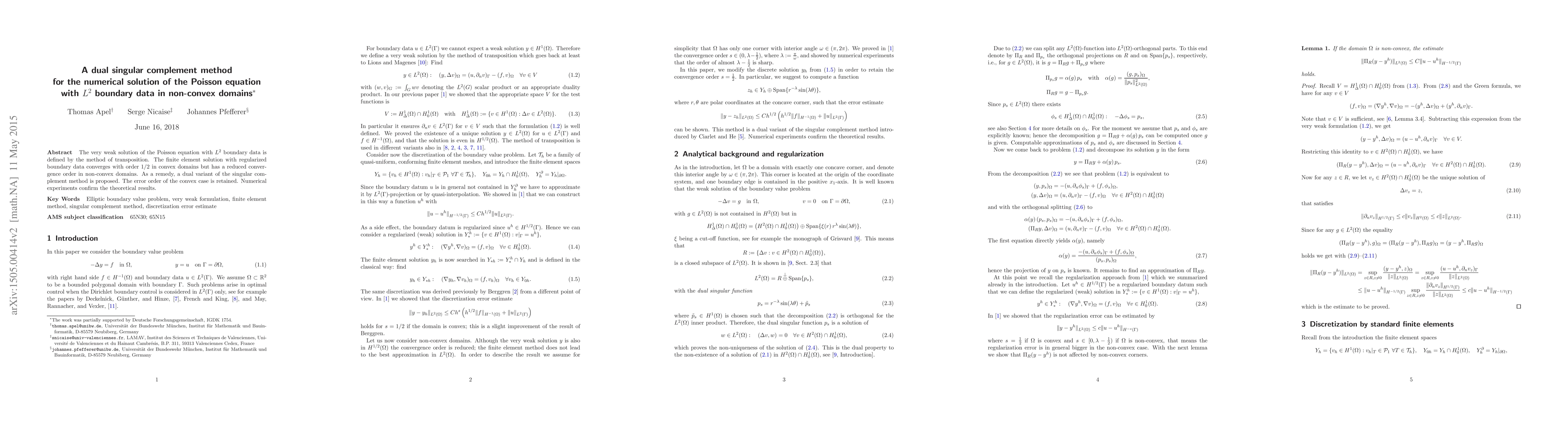 The very weak solution of the Poisson equation with $L^2$ boundary data is defined by the method of transposition. The finite element solution with regularized boundary data converges with order $1/2$ in convex domains but has a reduced convergence order in non-convex domains. As a remedy, a dual variant of the singular complement method is proposed. The error order of the convex case is retained. Numerical experiments confirm the theoretical results.