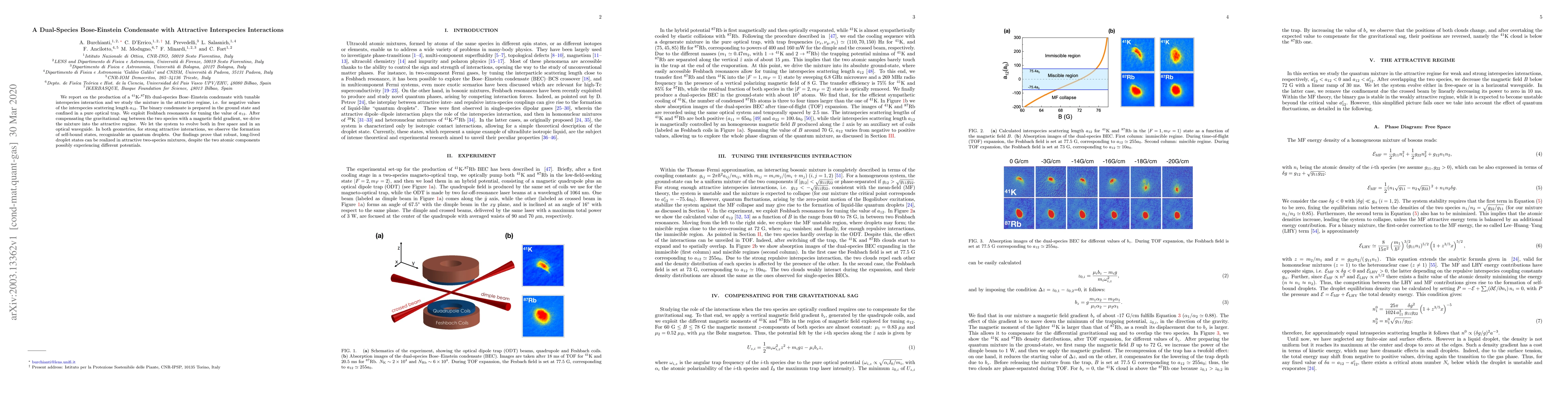 We report on the production of a $^{41}$K-$^{87}$Rb dual-species Bose-Einstein condensate with tunable interspecies interaction and we study the mixture in the attractive regime, i.e. for negative values of the interspecies scattering length $a_{12}$. The binary condensate is prepared in the ground state and confined in a pure optical trap. We exploit Feshbach resonances for tuning the value of $a_{12}$. After compensating the gravitational sag between the two species with a magnetic field gradient, we drive the mixture into the attractive regime. We let the system to evolve both in free space and in an optical waveguide. In both geometries, for strong attractive interactions, we observe the formation of self-bound states, recognizable as quantum droplets. Our findings prove that robust, long-lived droplet states can be realized in attractive two-species mixtures, despite the two atomic components may experience different potentials.