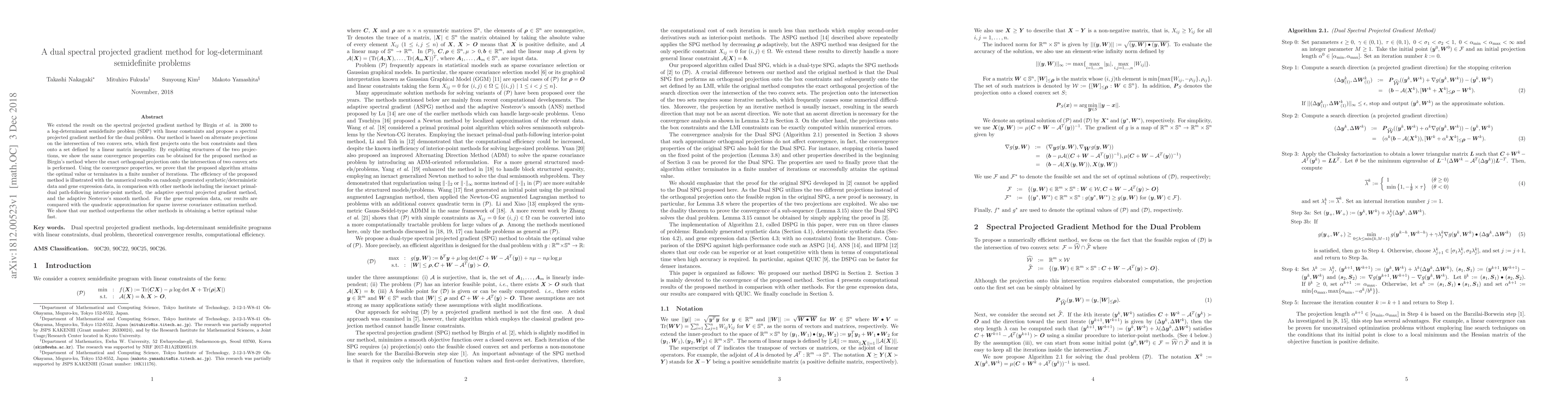 This paper proposes a dual spectral projected gradient method for solving log-determinant semidefinite problems with linear constraints, demonstrating its efficiency and convergence properties through numerical comparisons with other optimization techniques. The method outperforms alternatives in achieving better optimal values quickly, as shown in experiments with both synthetic and gene expression data.