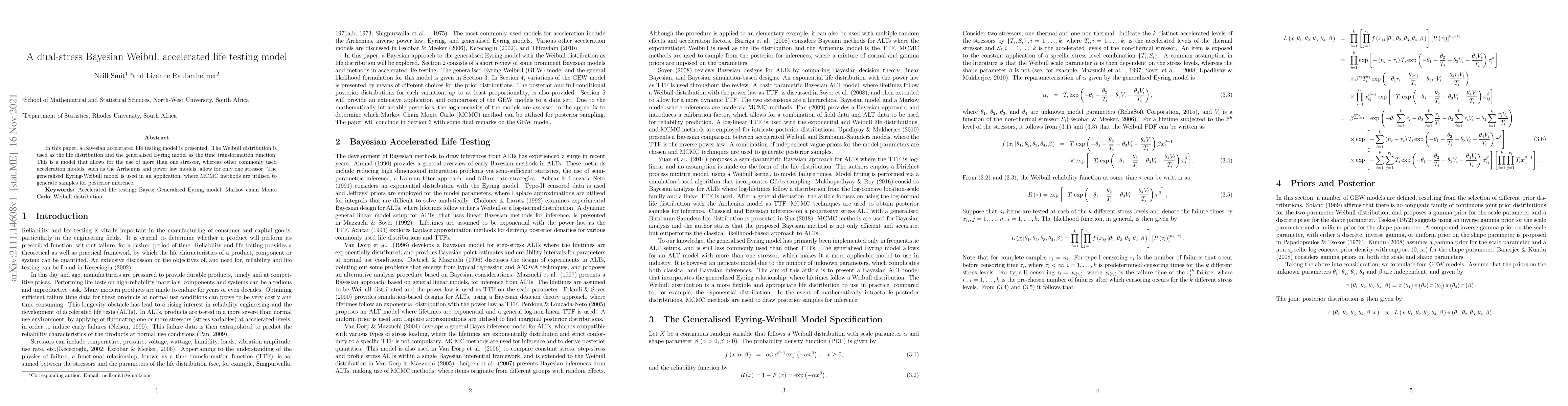 This paper introduces a Bayesian accelerated life testing model using the Weibull distribution and generalised Eyring model, enabling the analysis of multiple stressors. MCMC methods are applied to generate posterior samples for inference.